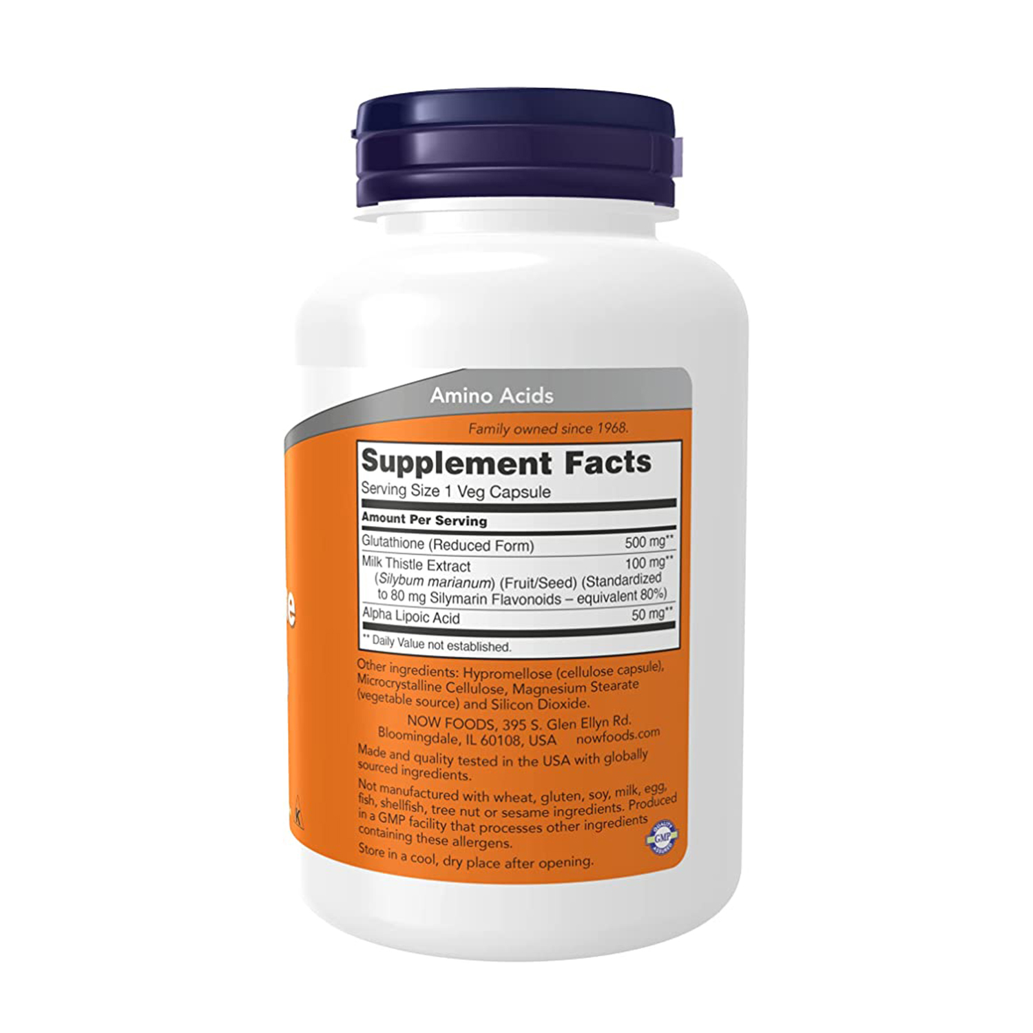 Glutathione (Reduced Form), Milk Thistle Extract (Silybum marianum)(Fruit/Seeds)(Standardized to 80mg Silymarin Flavonoids - equivalent 80%), Alpha Lipoic Acid. Other Ingredients: Hypromellose (cellulose capsule), Microcrystalline Cellulose, Magnesium Stearate (vegetable source), and Silicon Dioxide.