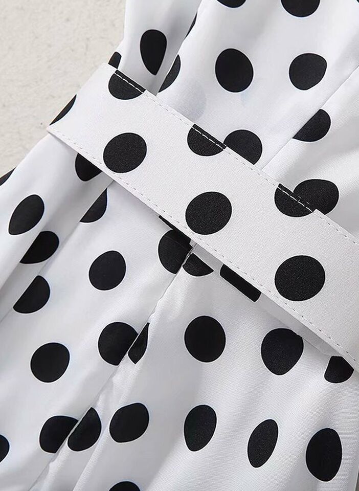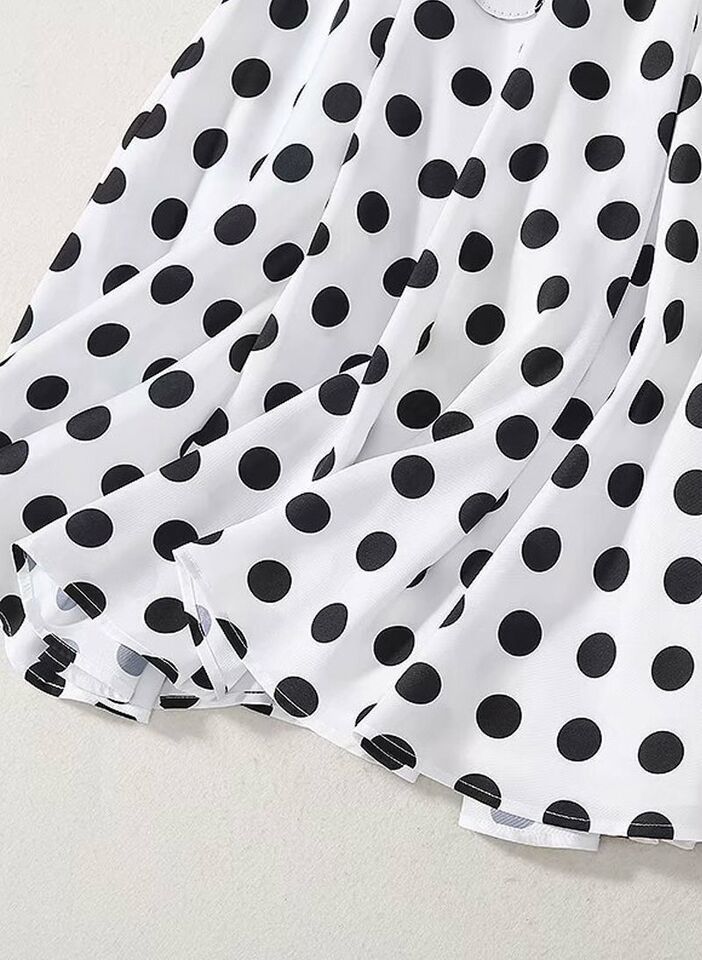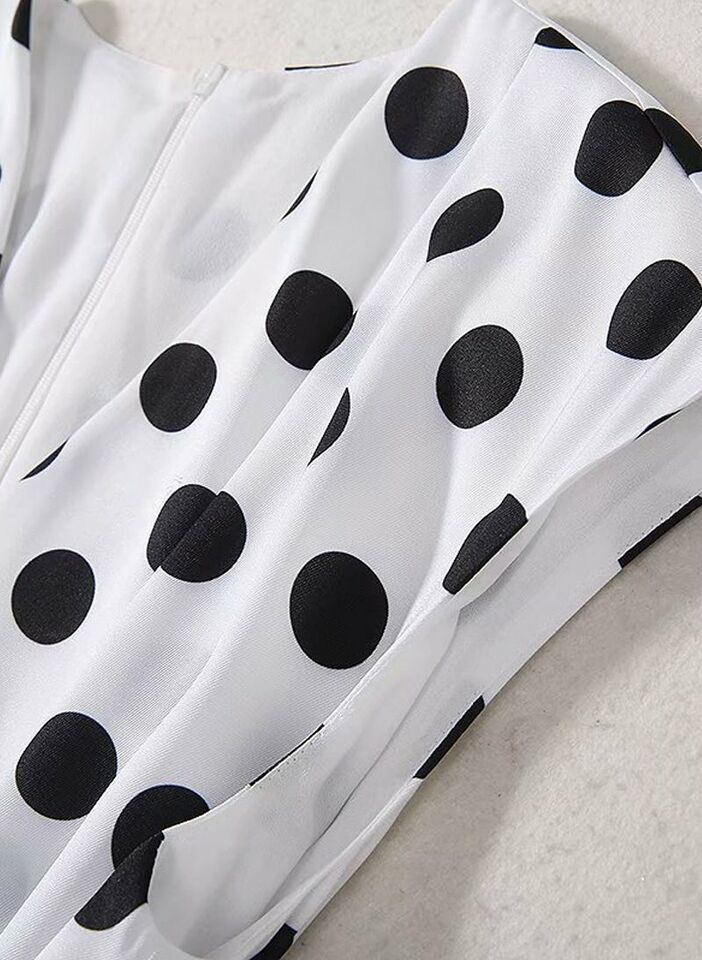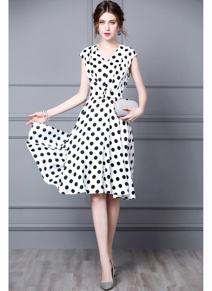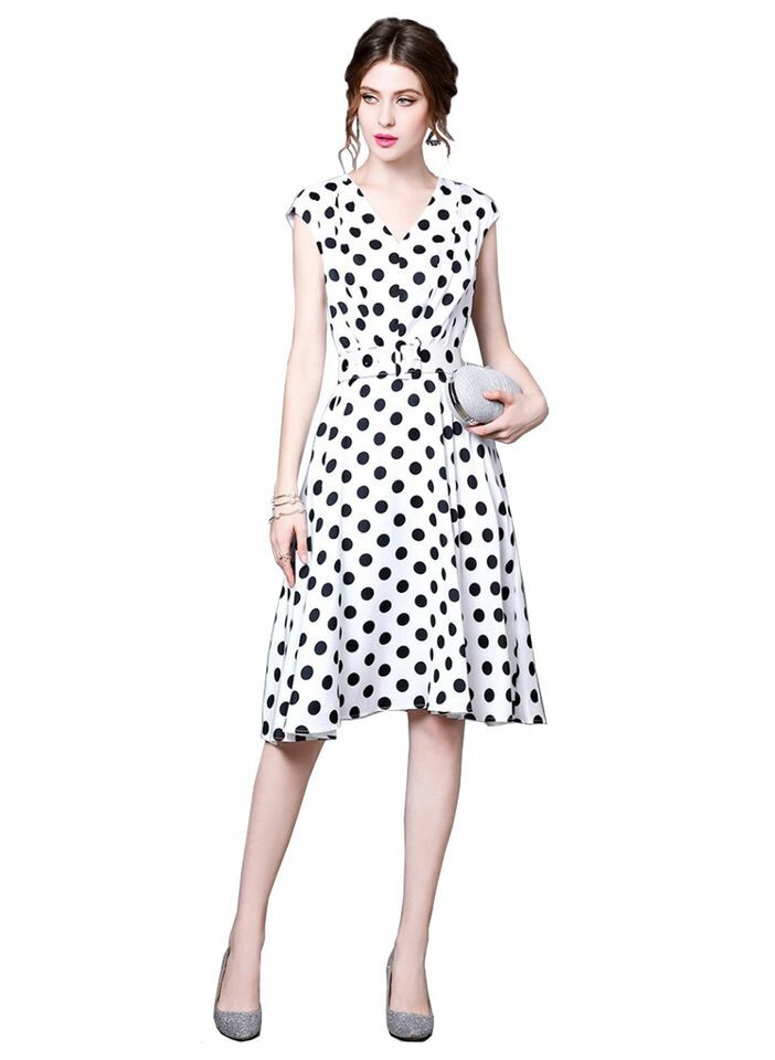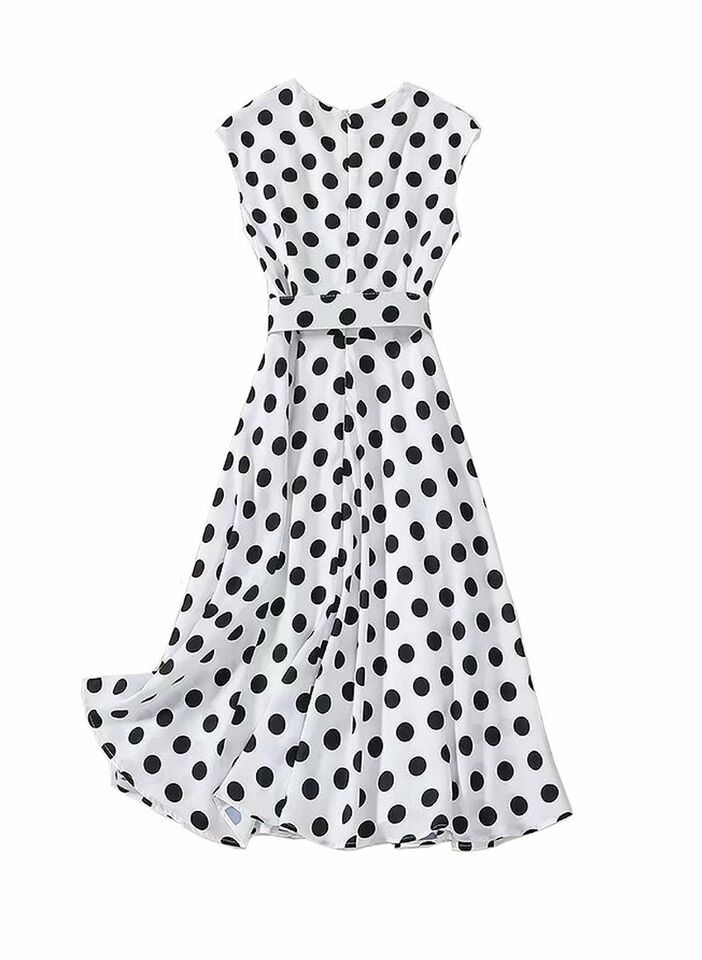 Women's Queen Letizia Inspired Sleeveless V-neck Flared Midi Dress in Polka Dot