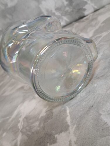 This Gothic-style candy jar is sure to add a spooky touch to your Halloween decor. The jar features a clear glass body with an iridescent finish and a skull design on the lid. Measuring 5 1/2 inches in height and 4 inches in width, this jar is perfect for storing your favorite candies or snacks.