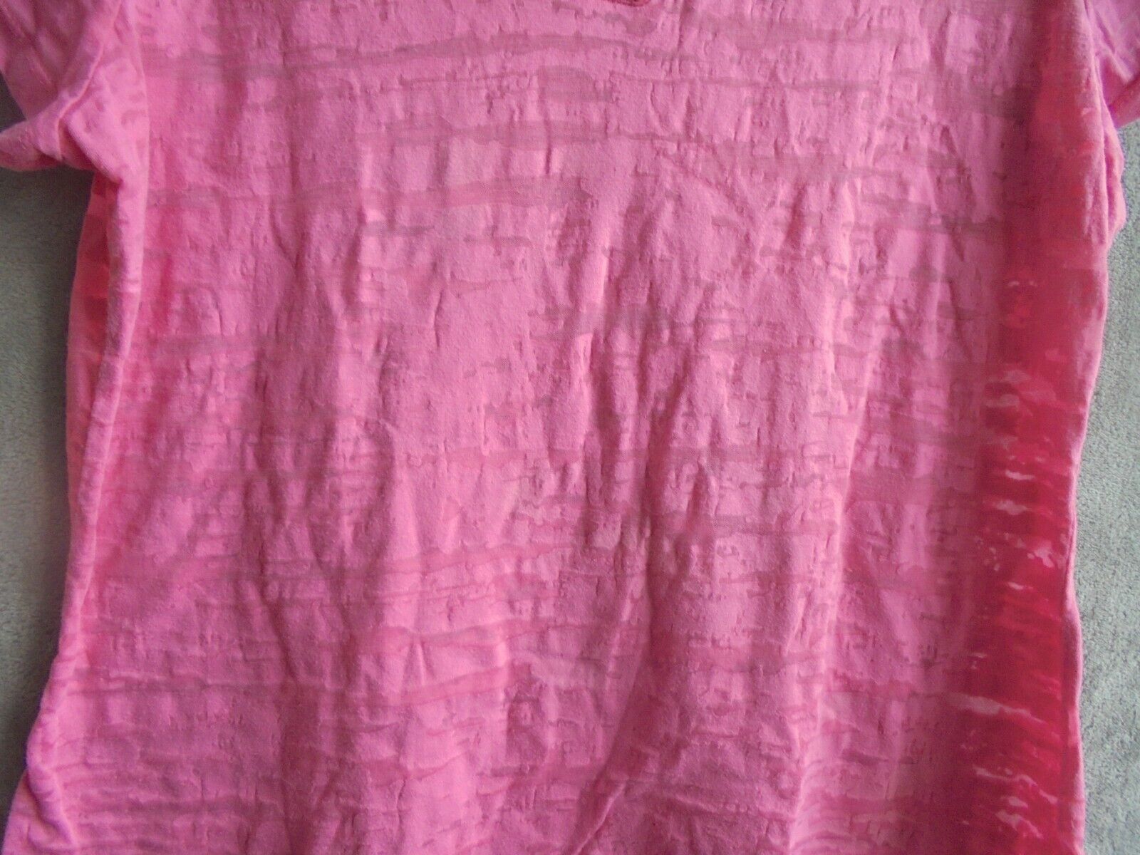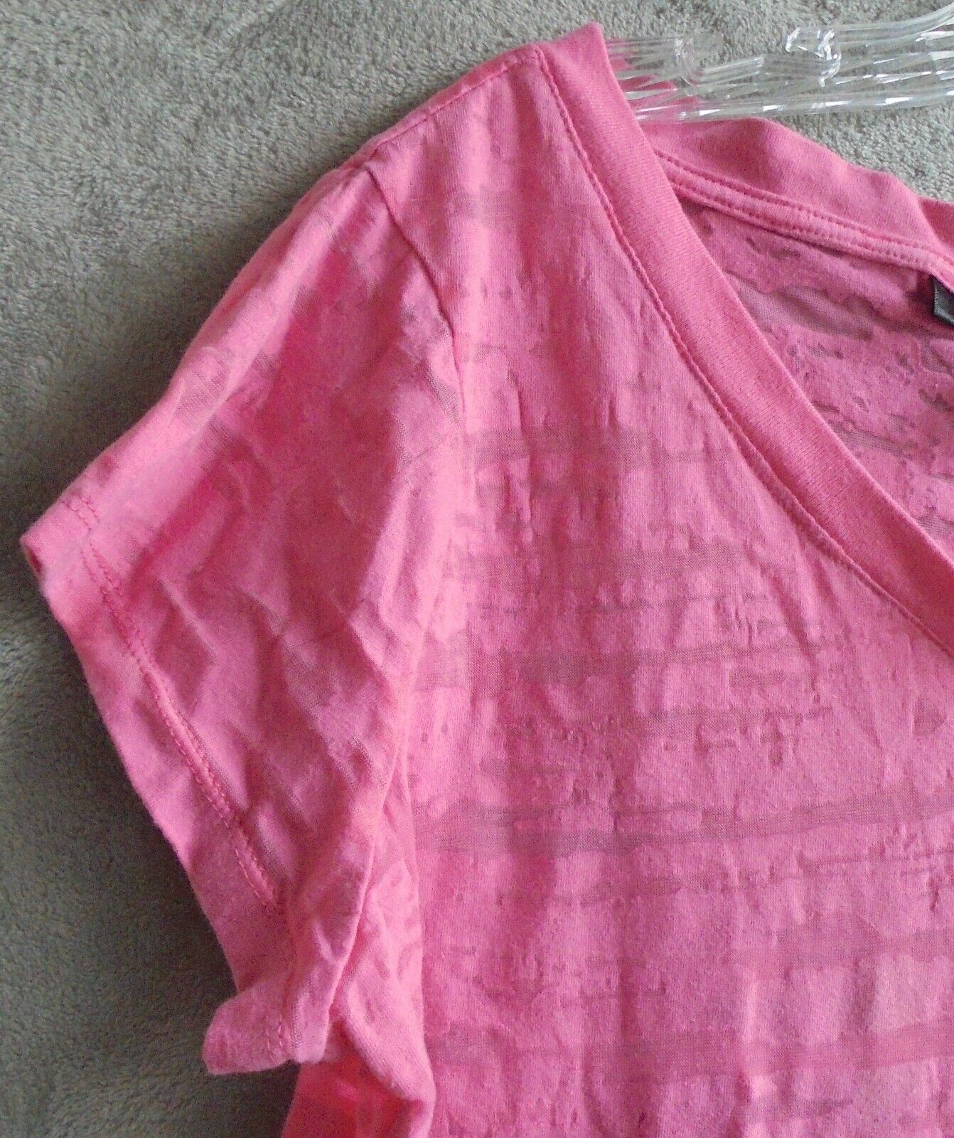 Description: Great summer top! Lightweight, soft and semi sheer. Bright pink. Short cap sleeves. V-neck. Light embossed print.
