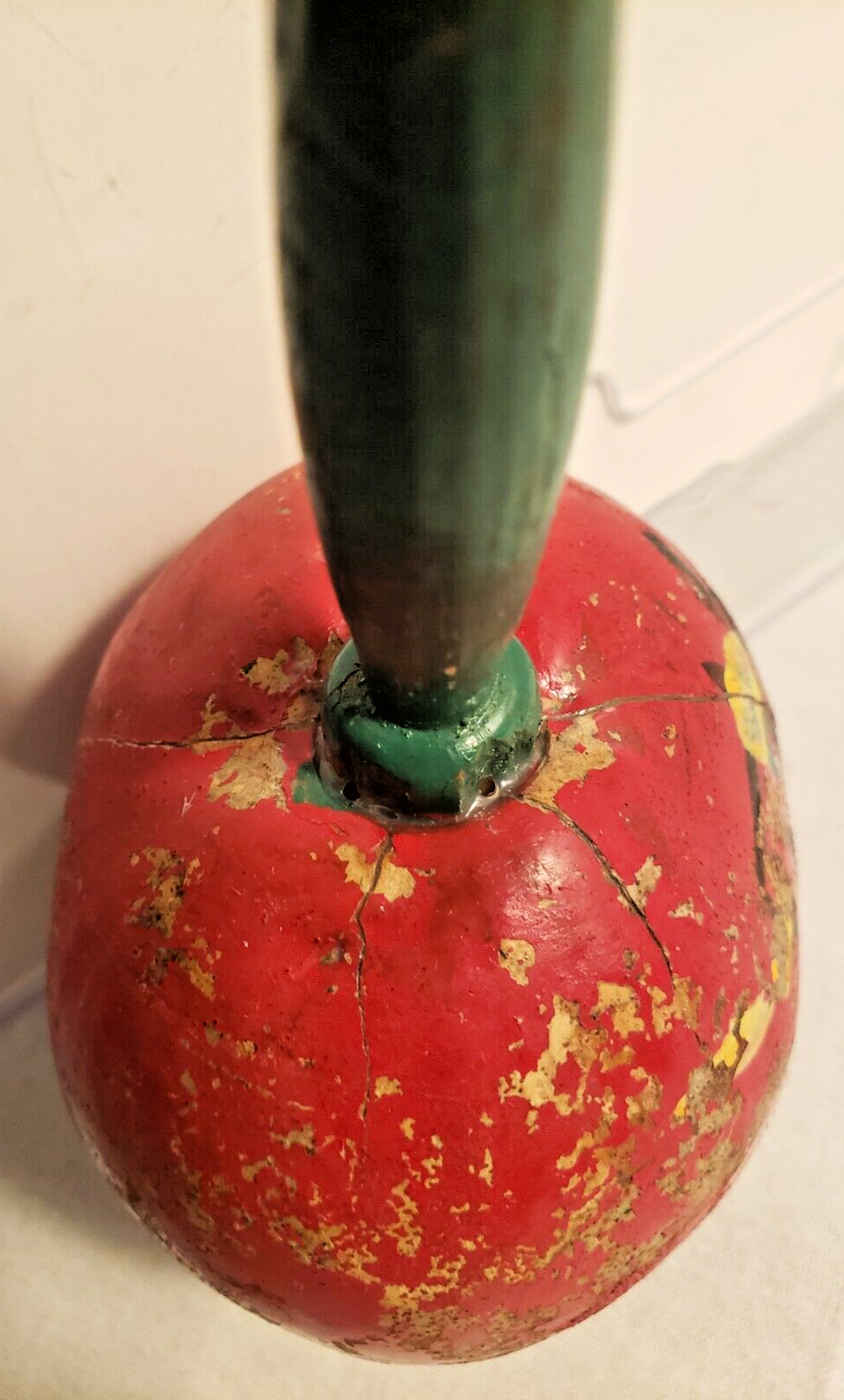 Fair used condition. Item shows heavy signs of wear. It's a survivor, so we're glad to have it. Although you can see some thin stress cracks in the item around the handle base, the Rattle is very solid and has no soft spots. The Rattle works properly (no internal pieces are missing). Some paint chipping. See pics. Priced accordingly.