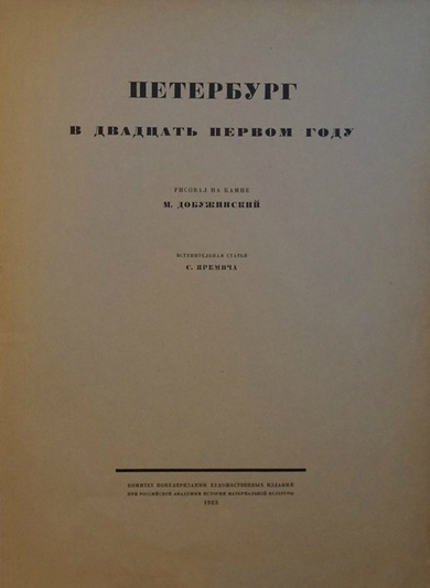 Short description: In Russian. Dobuzhinsky, Mstislav Valeryanovich. St. Petersburg in the Twenty-First Year. Petrograd: Compilation of the Popularized Editions of the Russian Academy of Material Culture, 1923. The image is provided for reference only. It may reflect condition of one of the available copies or only help in identifying the edition. Please feel free to contact us for a detailed description of the copies available. SKU9156779