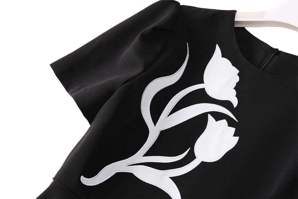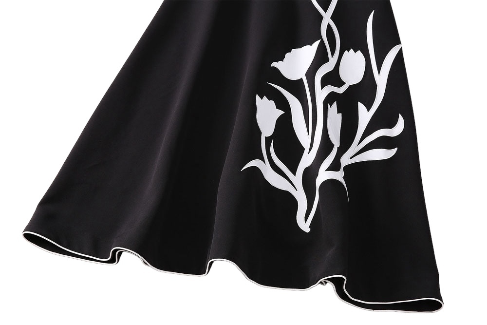 Crafted from quality crepe fabric, our budget-friendly version features puffed shoulders and a flared A-line skirt. The stunning graphic tulip motif runs up one side of the skirt and the opposite side of the bodice, standing out spectacularly against the white background. Fully lined with a back zip closure. We also have a black color option available in stock.