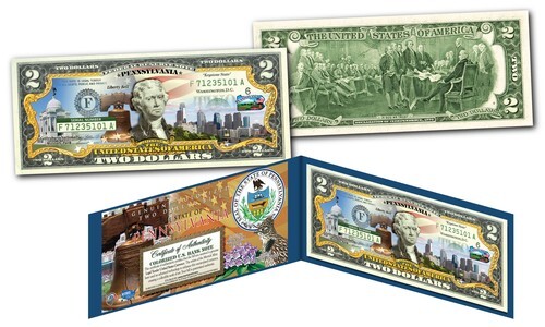 Celebrate America with the popularity of the statehood series with these colorized $2 bills. Each bill features the state's name, bird, flower, nickname, emblem, year of admission, and State Quarter graphic. The State Quarter featured on the bill is an actual watermark security feature?the first of its kind! Americans from all over the country are rushing to obtain the new ?Statehood? Genuine Two Dollar bills, while they last. The coveted U.S. Government $2 bill is rarely seen in circulation and only banks and currency dealers may obtain special uncirculated bills directly from the Federal Reserve Bank. Now for the first time ever these enhanced uncirculated full color two dollar bills are available exclusively from this limited time offer. Two dollar bills are among the most beautiful of all U.S. circulating currency and now the rarely circulated $2 bill is even rarer with exclusive overlay of our beautiful States. Each Bill comes with a full-Color Certificate of Authenticity handsomely displayed in a Special Gold Foil Museum-Quality Folio. Don?t Miss Your Chance to Order?.Very Limited Quantity Available!
