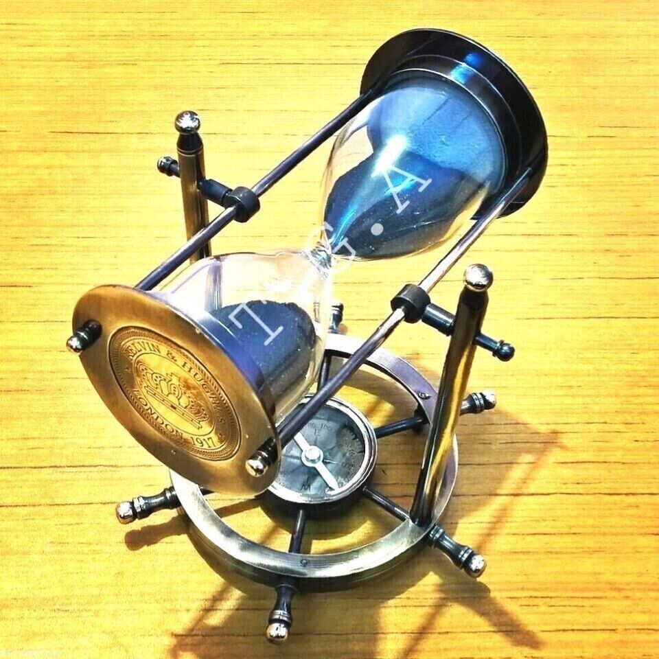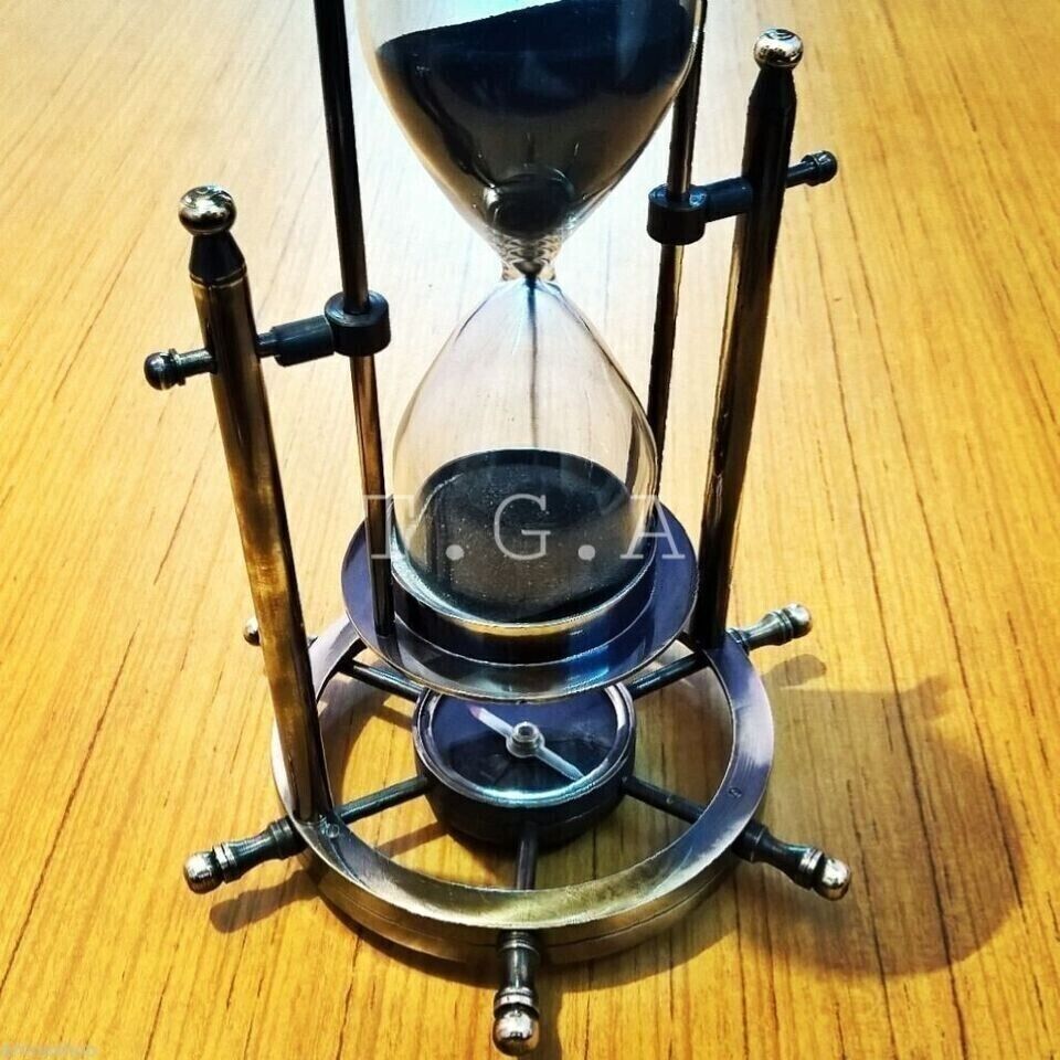 Brass Antique Sand Timer Hourglass With Wheel Compass Base & Hanging Dรฉcor