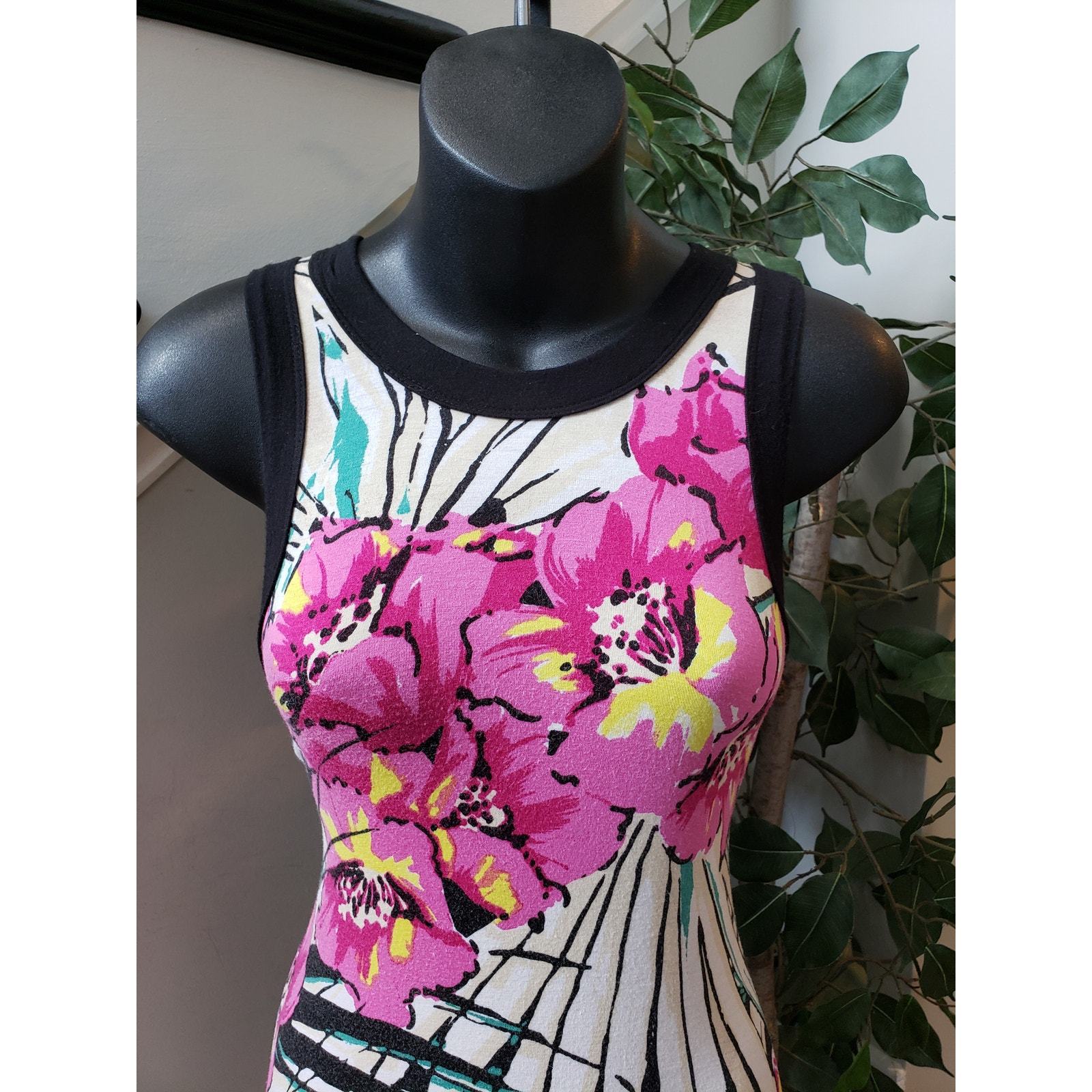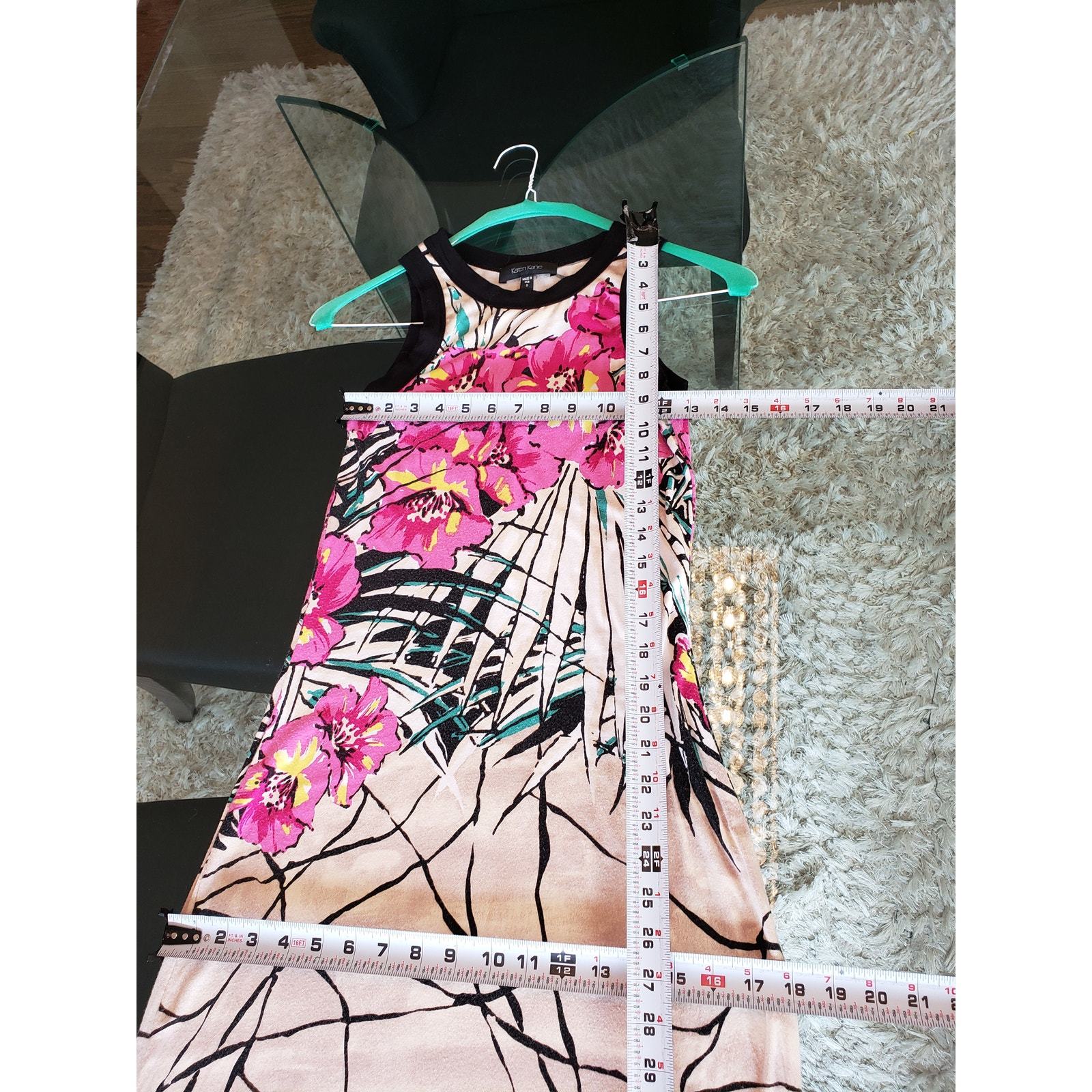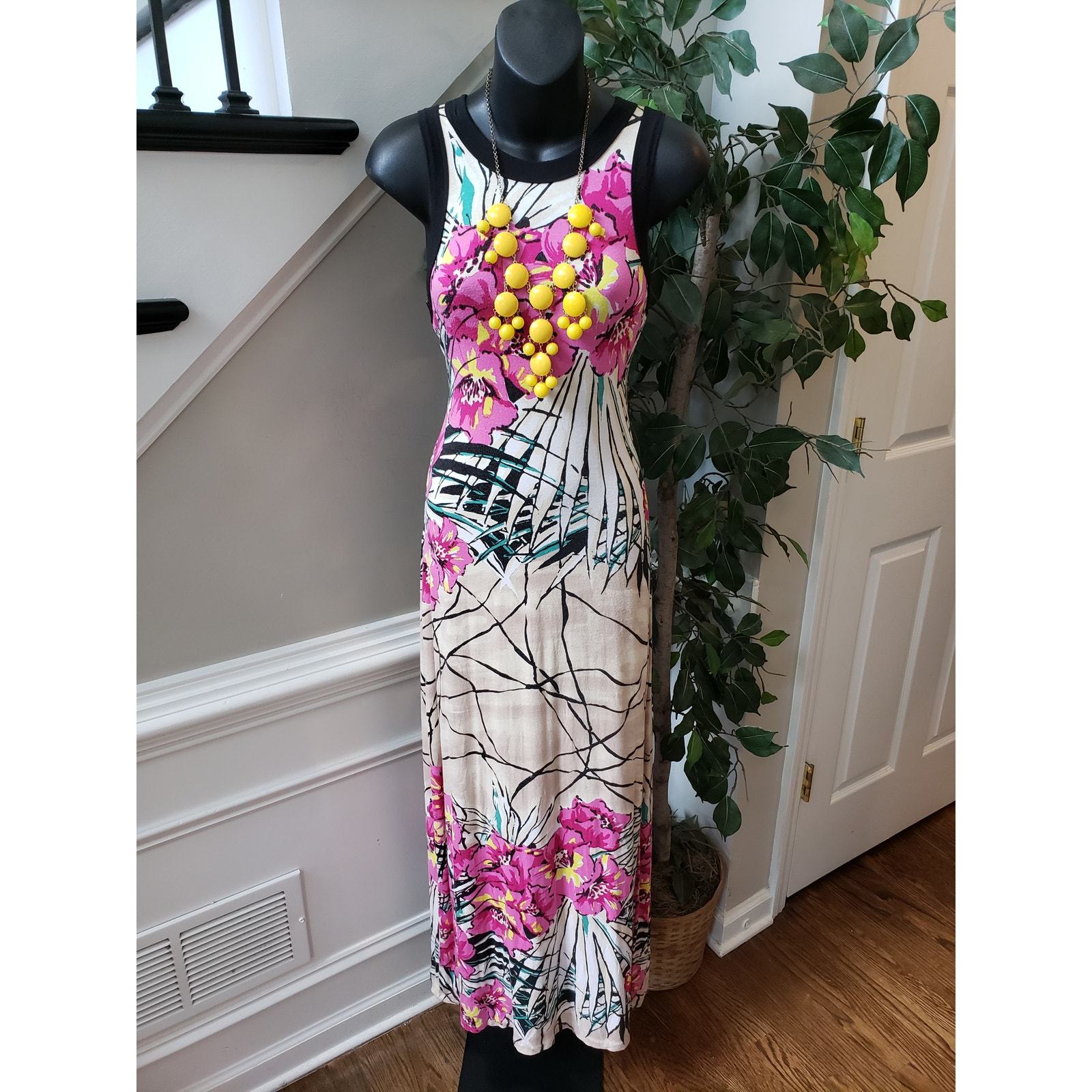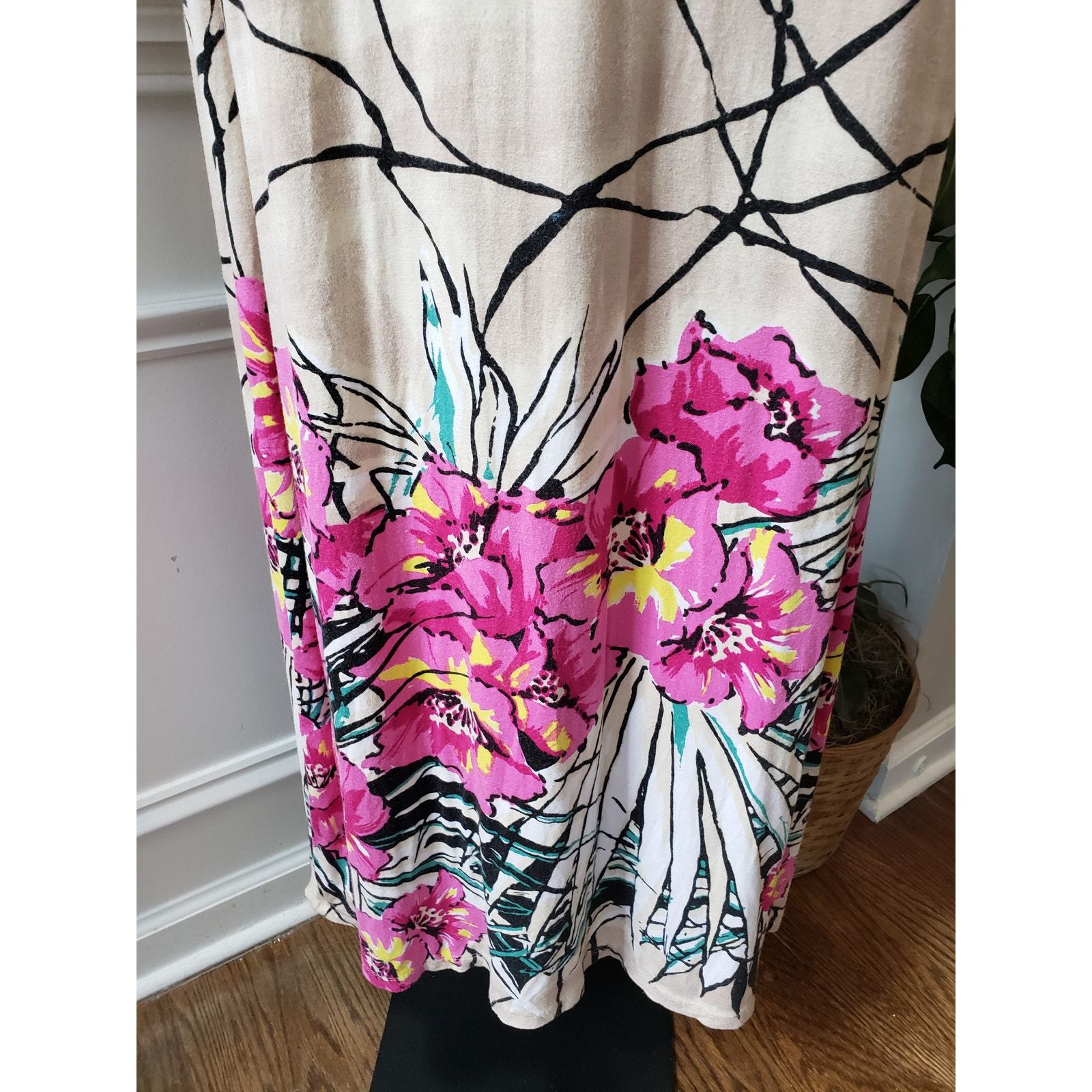 Karen Kane Long Maxi Dress Women's S Beige Pink Geometric Crew Neck Sleeveless