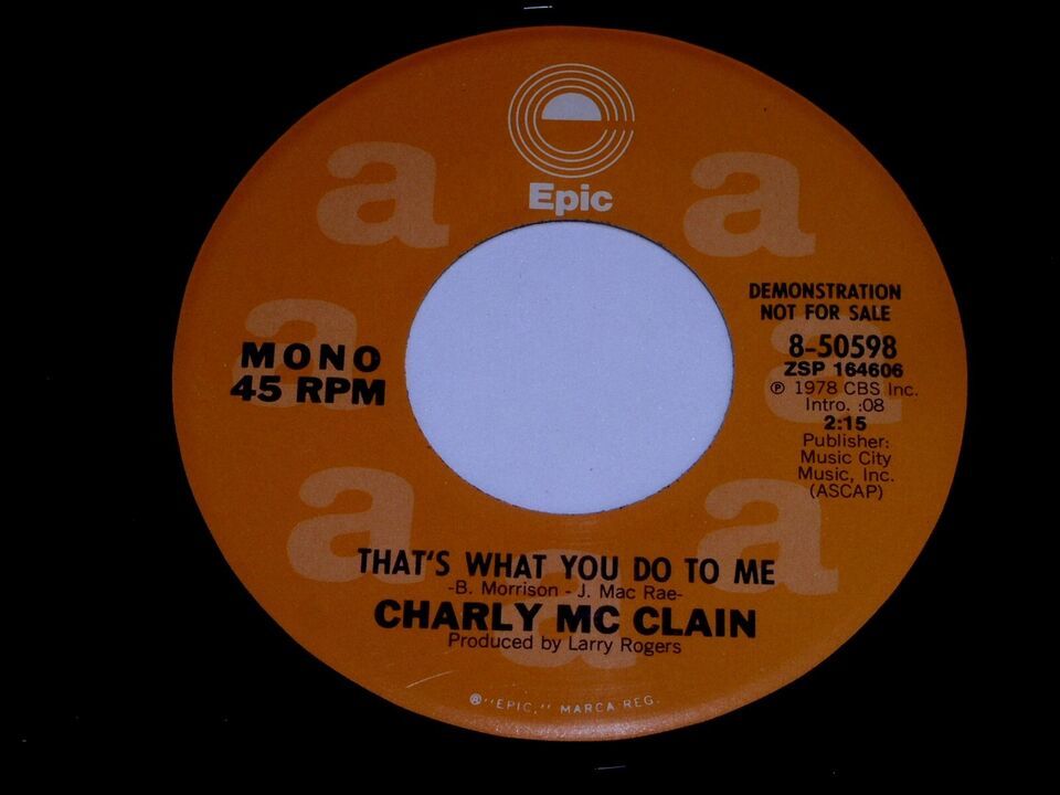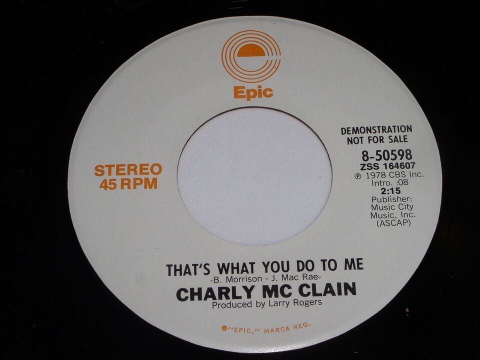 This is an original, vintage promotional 45 rpm phonograph record by Charly McClain entitled, "That's what You Do To Me". This is the mono/stereo issue. Record label Epic 8-50598. Comes in its original Epic paper sleeve as shown.