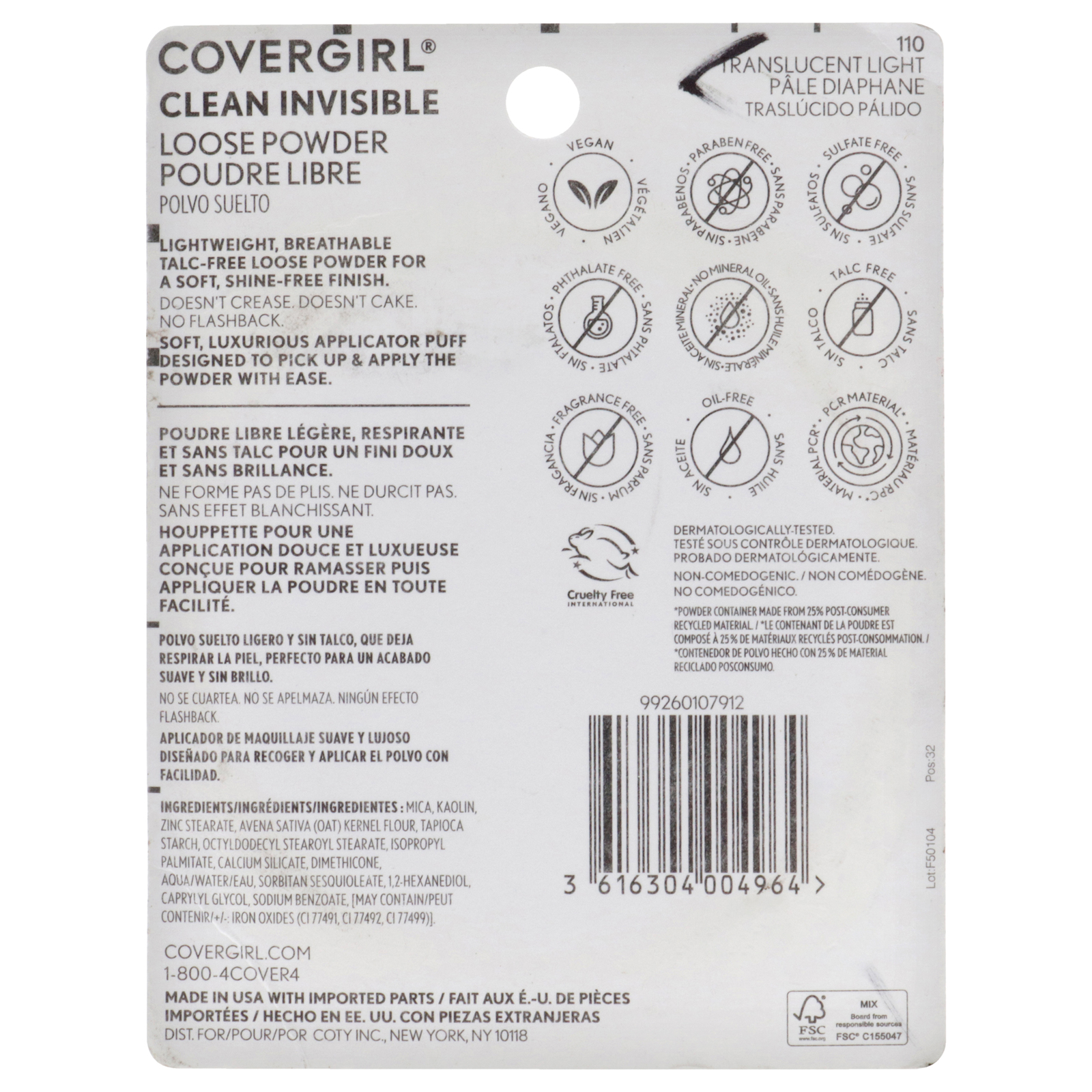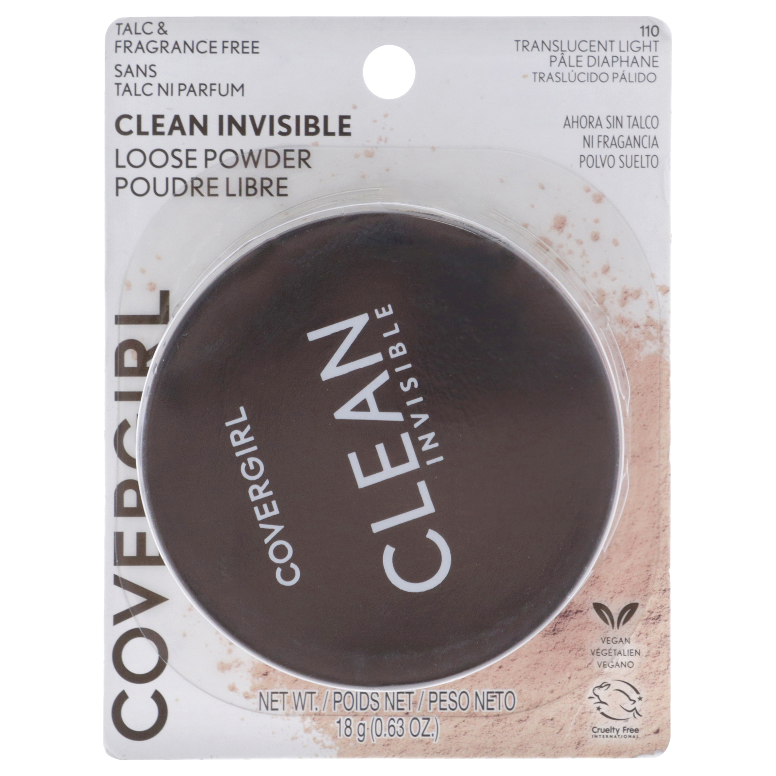 Clean Invisible Loose Powder in shade 110 Translucent Light by CoverGirl is a 0.63 oz loose powder designed to set makeup while providing a natural, airbrushed finish. Its translucent formula works for a wide range of skin tones, helping to control shine and smooth the appearance of pores. Lightweight and non-cakey, this powder keeps your makeup in place all day, leaving your skin with a soft, matte finish.