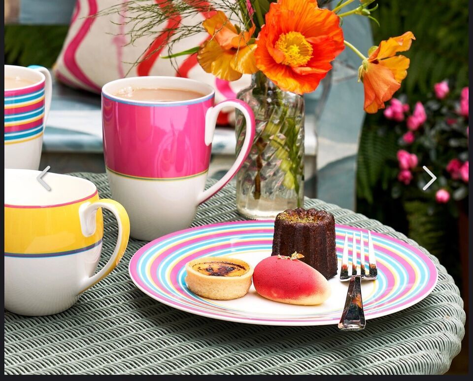 In a sunny shade accented with yellow pink and turquoise bands, this porcelain creamer has been inspired by the tropical shades of the island of Barbados. A must-have addition to your breakfast, coffee break, or dessert.