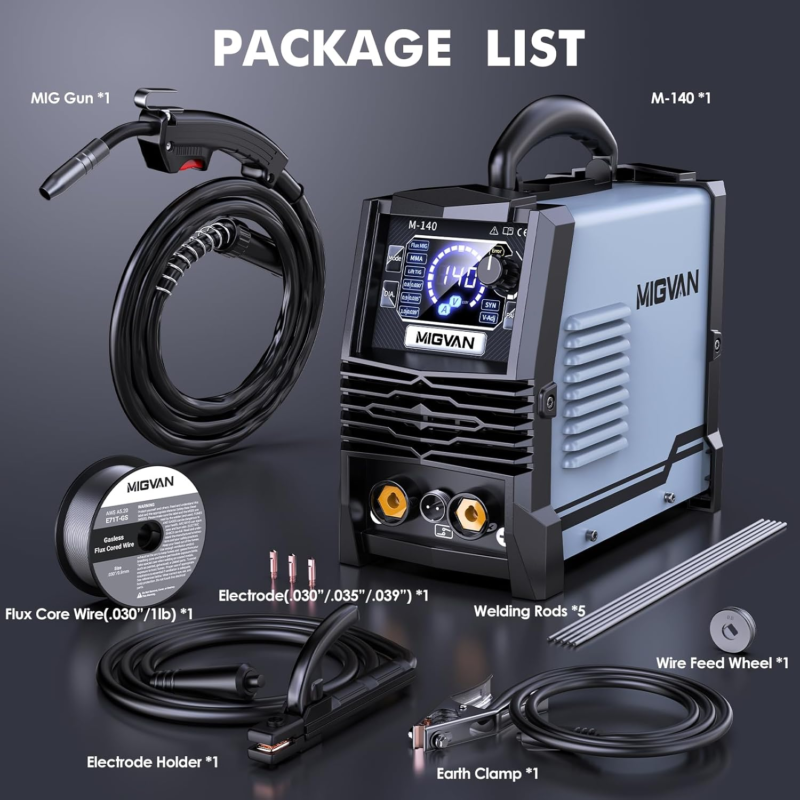 ? ?? ? ??????? ???????: The MIGVAN M-140 MIG welder is suitable for three welding modes: gasless flux-cored MIG, Lift TIG and stick. With a maximum output current of 140 amps, it can be used with .030"/.035"/.039" flux core wire. It can weld stainless steel, carbon steel, and even thicker steel perfectly, which can easily deal with the use scenarios such as machinery repair, yard repair, home repair, and DIY metal crafts.