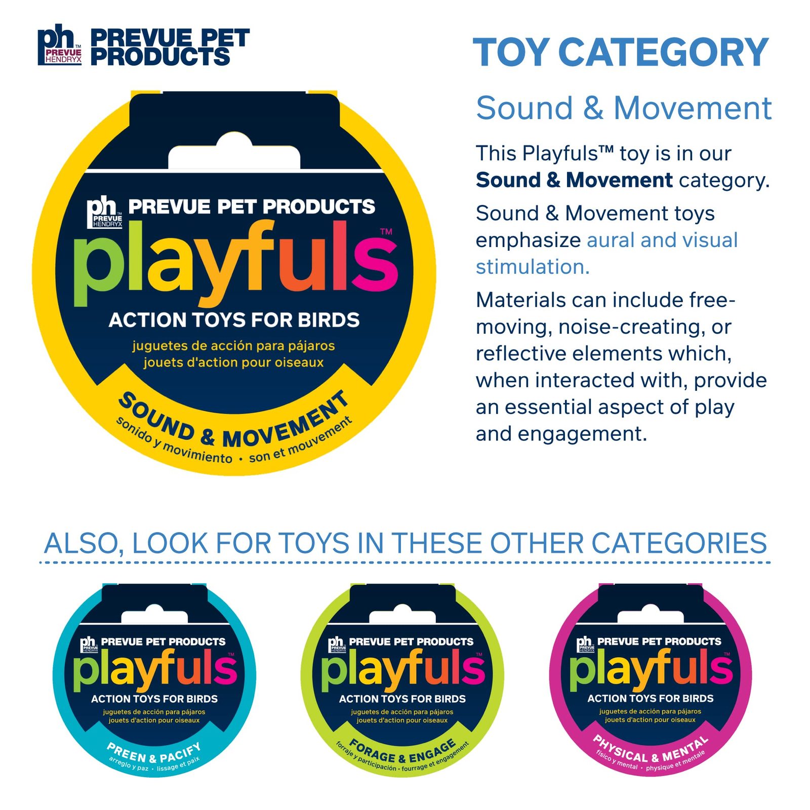 Details: Playfuls(tm) toy from Prevue Pet Products is a multi-sensory acivity toy, designed to entertain and engage birds on all levels. Sound and Movement toys emphasize aural and visual stimulation. Materials can include reflective, free-moving noise-creating elements, which provide and essential aspect of play and engagement. Toys are hand-made in Malaysia and can vary slightly in shape and size.