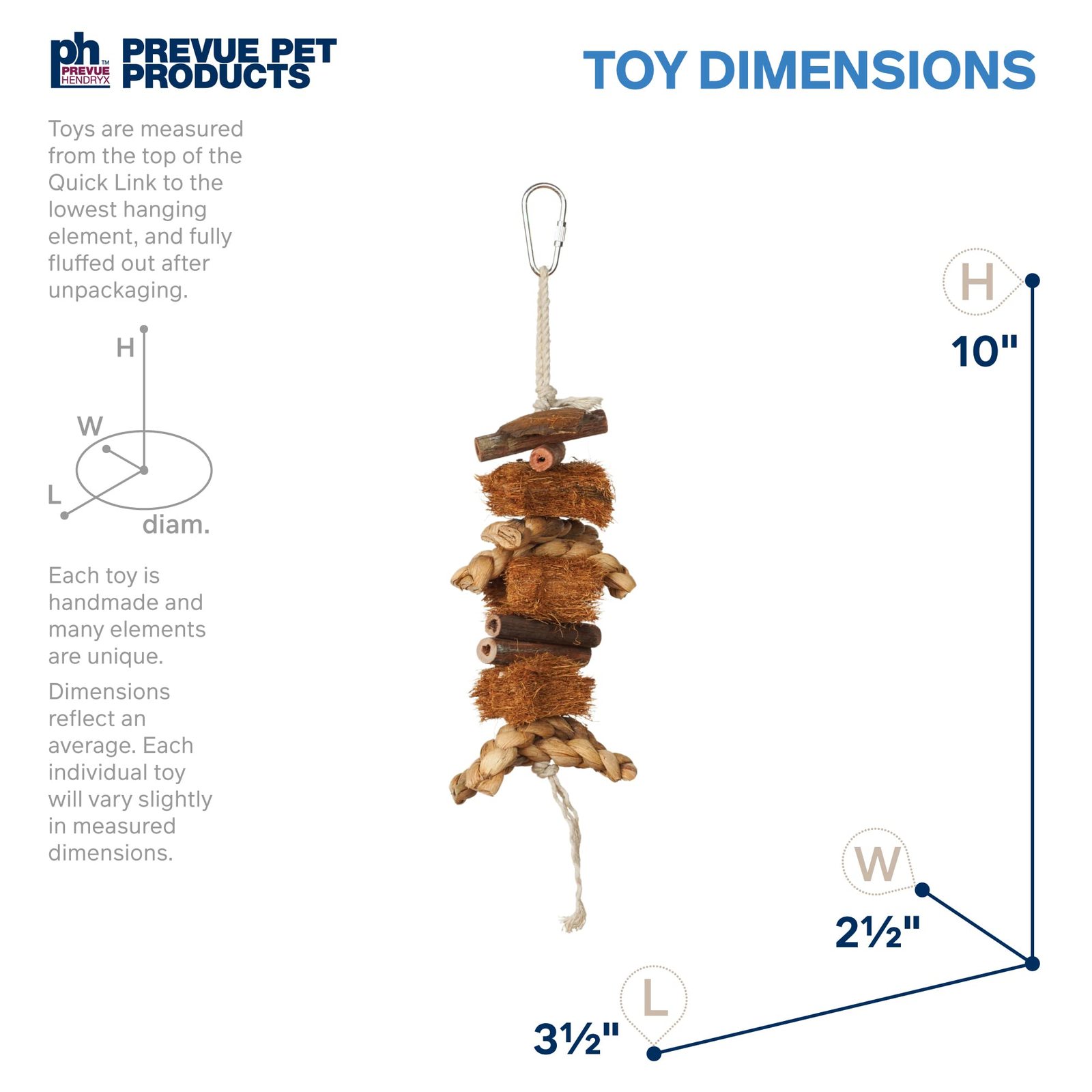 Details: Prevue Pet Products Naturals Coco Rope Mini bird toy 62803 is handmade from 100-percent natural, sustainable, materials providing your bird with mental stimulation and rugged physical play. Made with environmentally conscious hevea wood branches, banana stem rope, cotton twine, coconut fiber and coconut shell this bird toy encourages foot and beak exercise. Toy connects easily to cage with quick-link attachments and is hand made - actual measurements may vary slightly. As always, supervise birds at play. Our Naturals Coco Rope Mini bird toy is approximately 8-inch long and 2 1/2-inch wide, ideal for small to medium sized birds.
