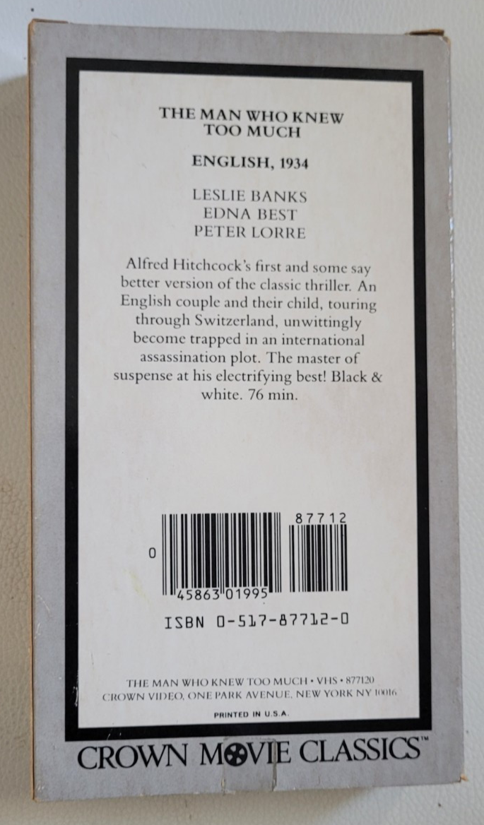 VHS The Man Who Knew Too Much Peter Lorre Crown Movie Classics Black & White