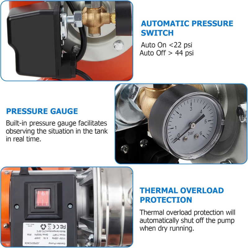 ?Stable and Reliable?: Constructed with stainless steel materials and carbon ceramic mechanical seals, this pump effectively prevents leaks and electrical leakage. The 6.5-foot UL power cord and grounding plug ensure safety. The automatic pressure switch allows the pump to start at 19 psi and stop at 38 psi. It also automatically shuts off when the pump runs dry.