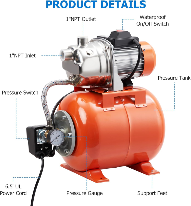 3/4HP Shallow Well Pump with Pressure Tank, Stainless Steel Water Transfer Pump, 115V Water Pump with Automatic Pressure Switch, Electric Utility Pump for Garden, Pool, Well, Irrigation?