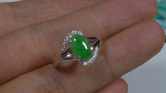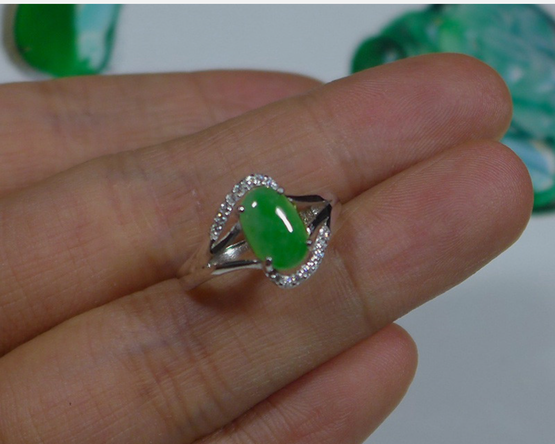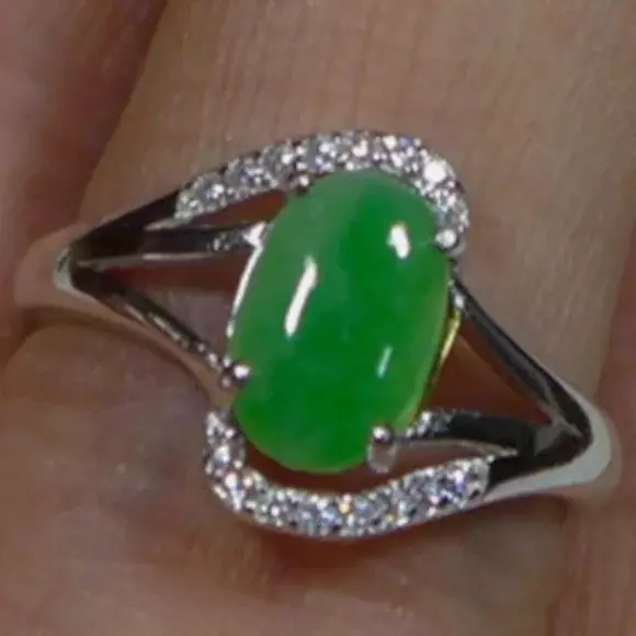 Certified Fine Natural Grade A Emerald Jadeite Jade Hand Carved Oval Cabochon S925 Ring