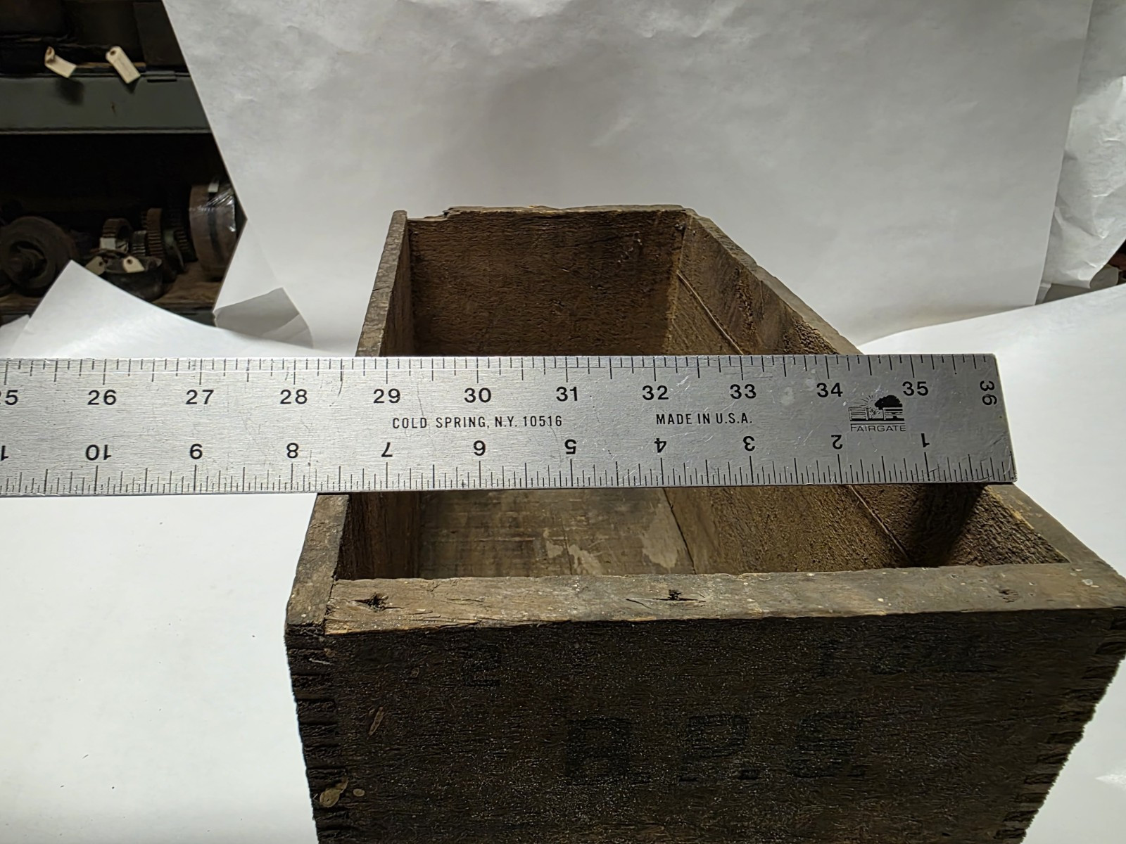 The box once had 2 1-gallon cans in it, it measures approx. 15-1/4" long x 7-7/8" high x 7-3/4" wide. Has some a little bit of damage to one top corner and end see pictures.