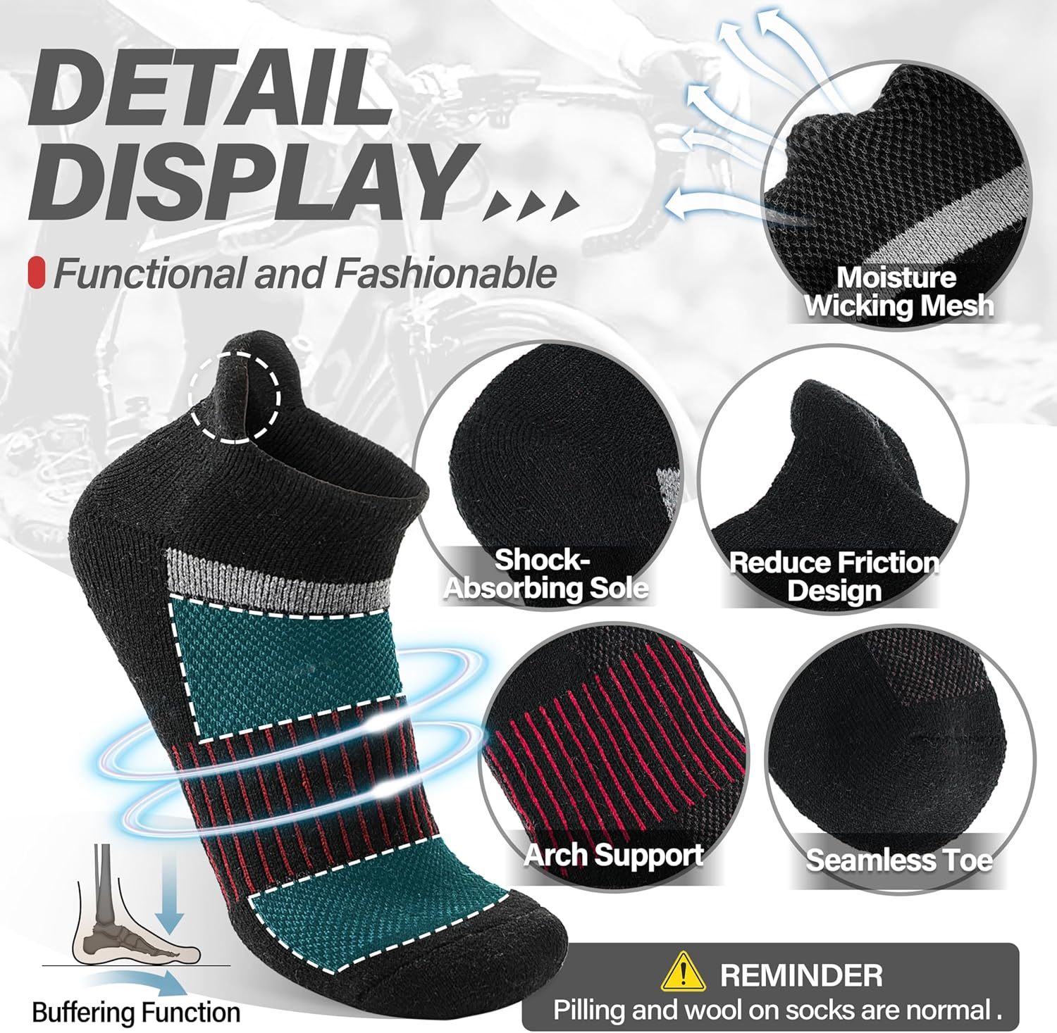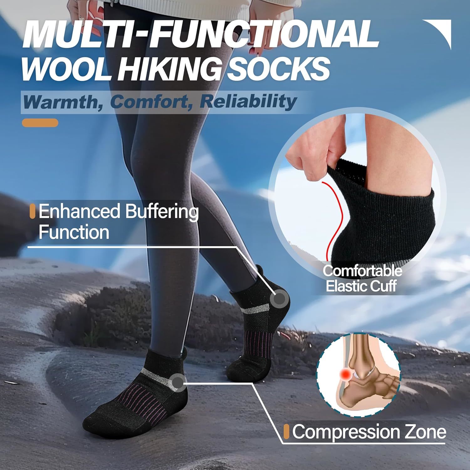 COMPOSITION - Anlisim warm hiking socks are made of 70% Merino Wool, 23% Polyester, 5% Spandex, 2% Nylon, which are wearable and durable. They regulate the temperature and keep you warm, so you can wear them in different season. PACKAGE SIZE- Here are 6 pairs merino wool hiking socks for mens and womens. And there are 2 sizes for choosing, M and L. Size M fits US women?s shoe size 5.5-10 / men?s shoe size 6-8.5. Size L fits US women?s shoe size 10-13 / men?s shoe size 8.5-12. The value package with fashion colors are most men?s and women?s favorite. MOISTURE WICKING- By designing with ventilation mesh function, these wool hiking ankle socks are breathable and release heat, which keep feet dry quickly and have great help in odor repelling. They are suitable for hiking, running, outdoor walking , trekking or working. PROTECTION FOR FEET - These womens wool running ankle socks have stretchy cuff and arch support, which can have great compression support to reduce fatigue, protect the Achilles tendon, improve the blood circulation, and keep socks fit snugly. Cushioned sole absorbs shock and reduces risk of blistering. Pull tab resist abrasion and prevent slipping. All of these provide more protection for your feet. GREAT GIFT - These winter wool socks are comfortable and durable, they can be a great gift for men and women on birthday, Christmas, Valentine? s Day or other festivals.