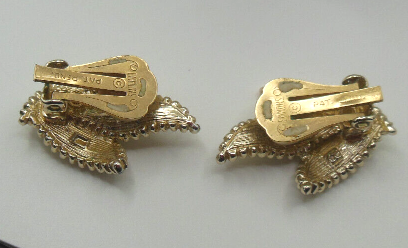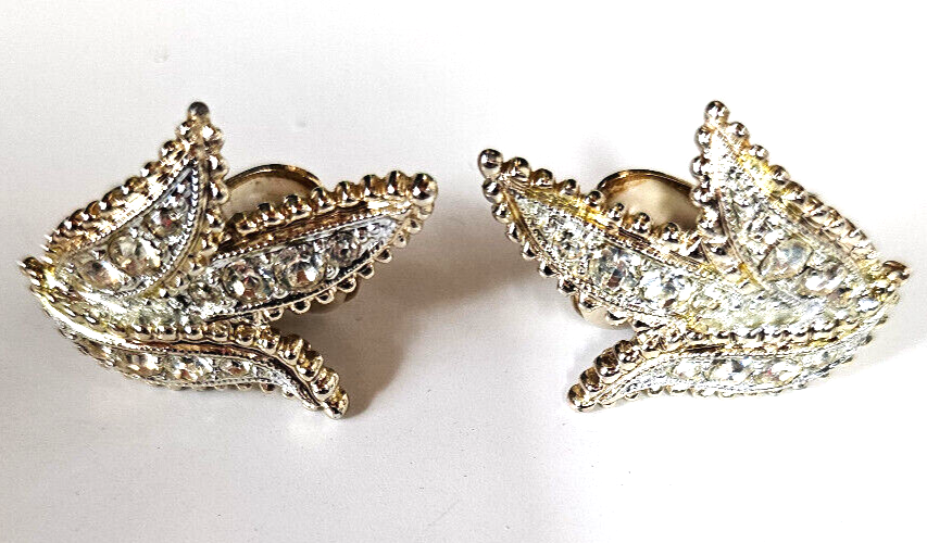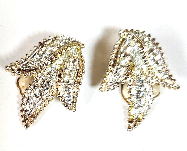 Vintage Emmons Gold-tone Clear Rhinestone 3 Leaf Clip-on Earrings 1.1/8" x 3/4"