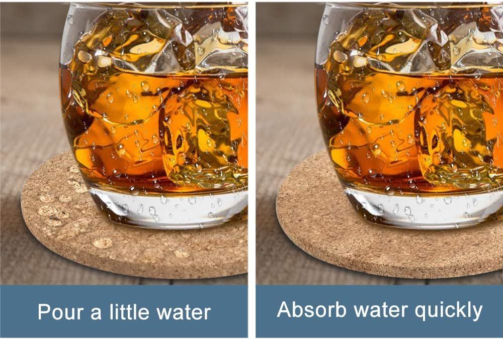 ?FEATURES?They are big enough for a wine glass and are soft enough not to scratch your nice, wooden furniture. They are a lot better at absorbing condensation from glasses than plain plastic coasters and a lot easier on your furniture. which is particularly helpful when you drink a large glass of iced tea on hot, humid summer days. ?FIT FOR ALMOST DRINKS?Cork Coasters are 4 inches in diameter and 1/5 inches thick. ?USE WIDELY?Keeps cold and hot drinks from damaging furniture. These cork coaster can be used as hot pads, put a few together for large pots and pans. Protect glasses from scratching surfaces. also eliminate the disturbing noise from the contact between glassware and tables. ?PRACTICAL GIFTS ? Our functional cork coasters make a great choice for housewarmings, birthdays and any occasion.Perfect for weddings,department, Christmas,birthday,restaurants or a friend who has just bought a home.