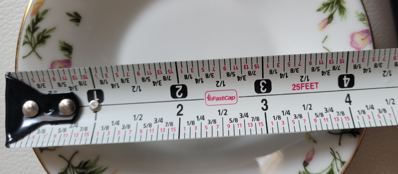 This teacup and saucer is in good used condition. There are no chips or cracks that I found. The cup measures approximately 2 1/4 inch tall. The saucer measures approximately 4.3/8 inches round. It would make a nice addition to a collection or for use.