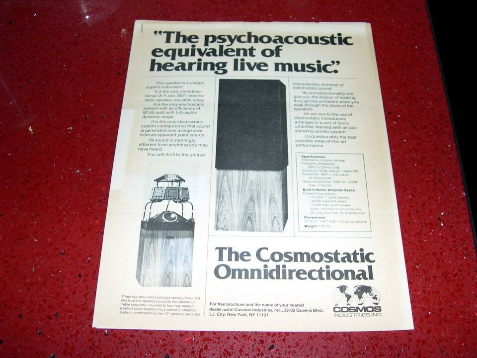 1981 COSMOSTATIC OMNIDIRECTIONAL SPEAKER SPEC SHEET. INCLUDES REPRINT TEST REPORT FROM AUDIO TRADE NEWS MARCH 1981 AND DEALER LIST. UNITED STATES ONLY PLEASE. FREE SHIPPING. COMES FROM SMOKE AND PET FREE HOME. NEAR MINT CONDITION.