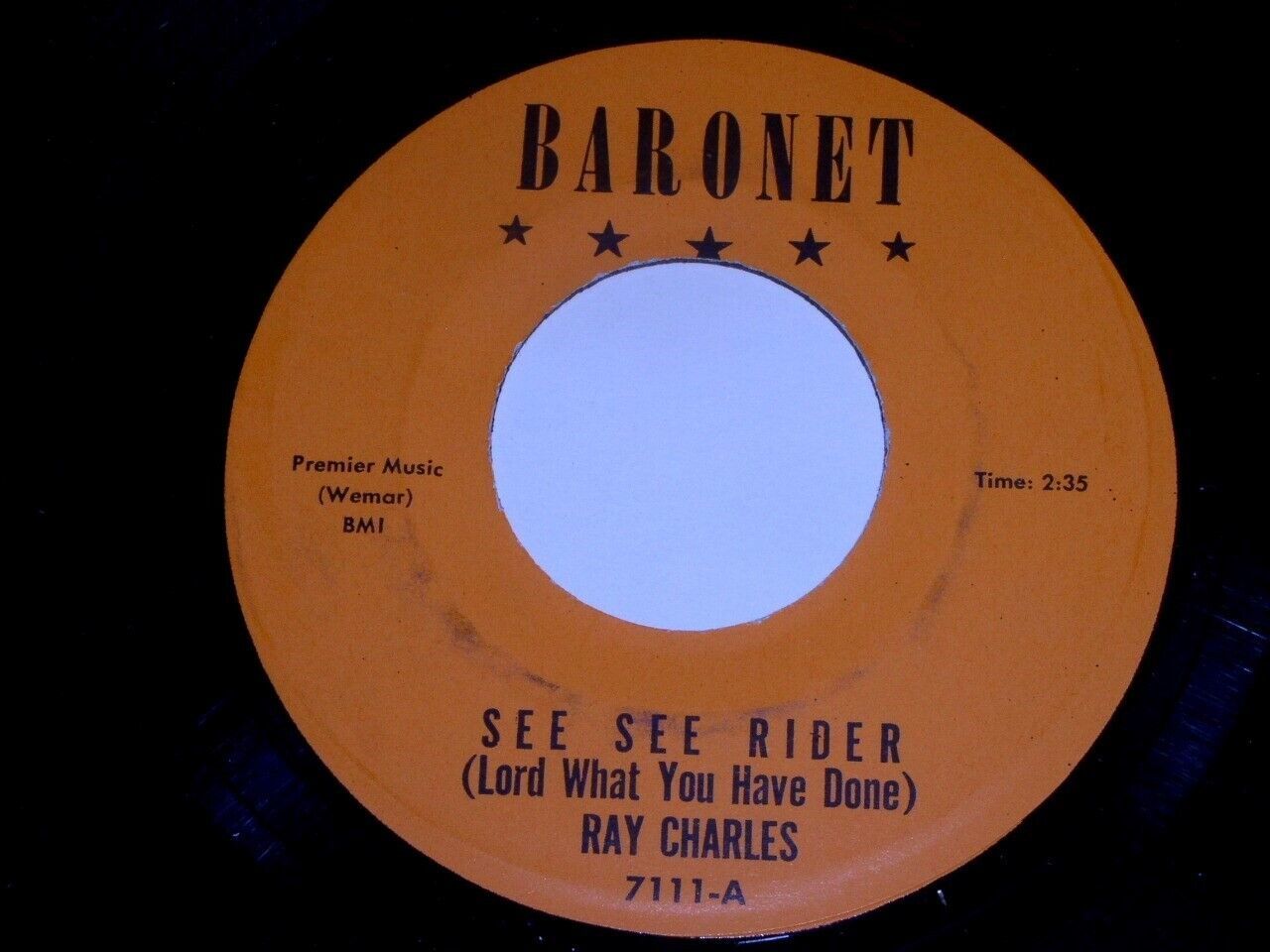 This is a vintage 45 rpm phonograph record by Ray Charles, entitled, "See See Rider". Flipside: "I used to Be So Happy". Record label: Baronet 7111.
