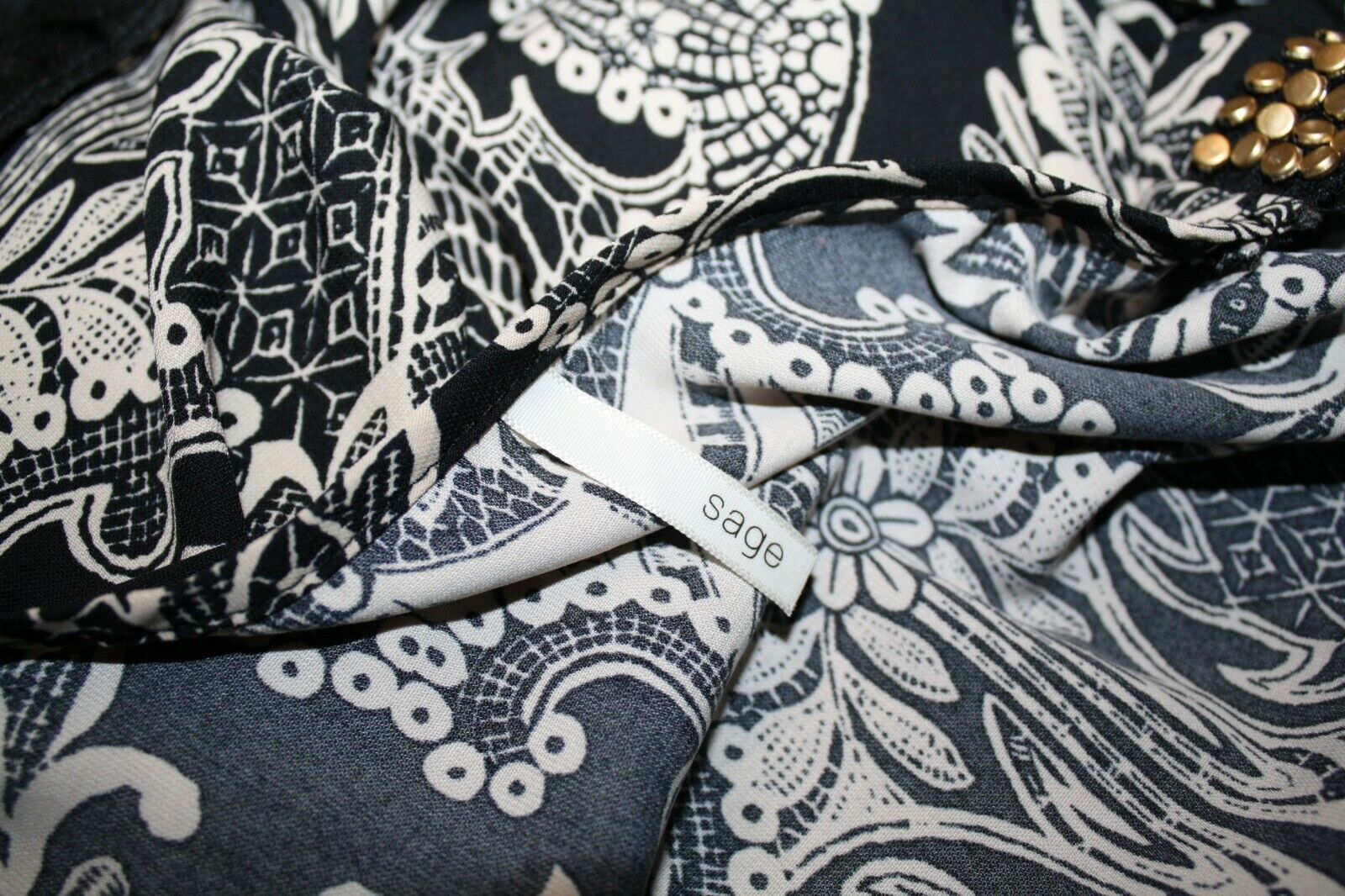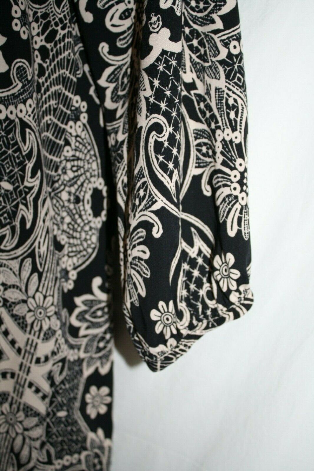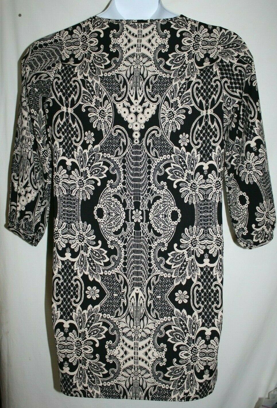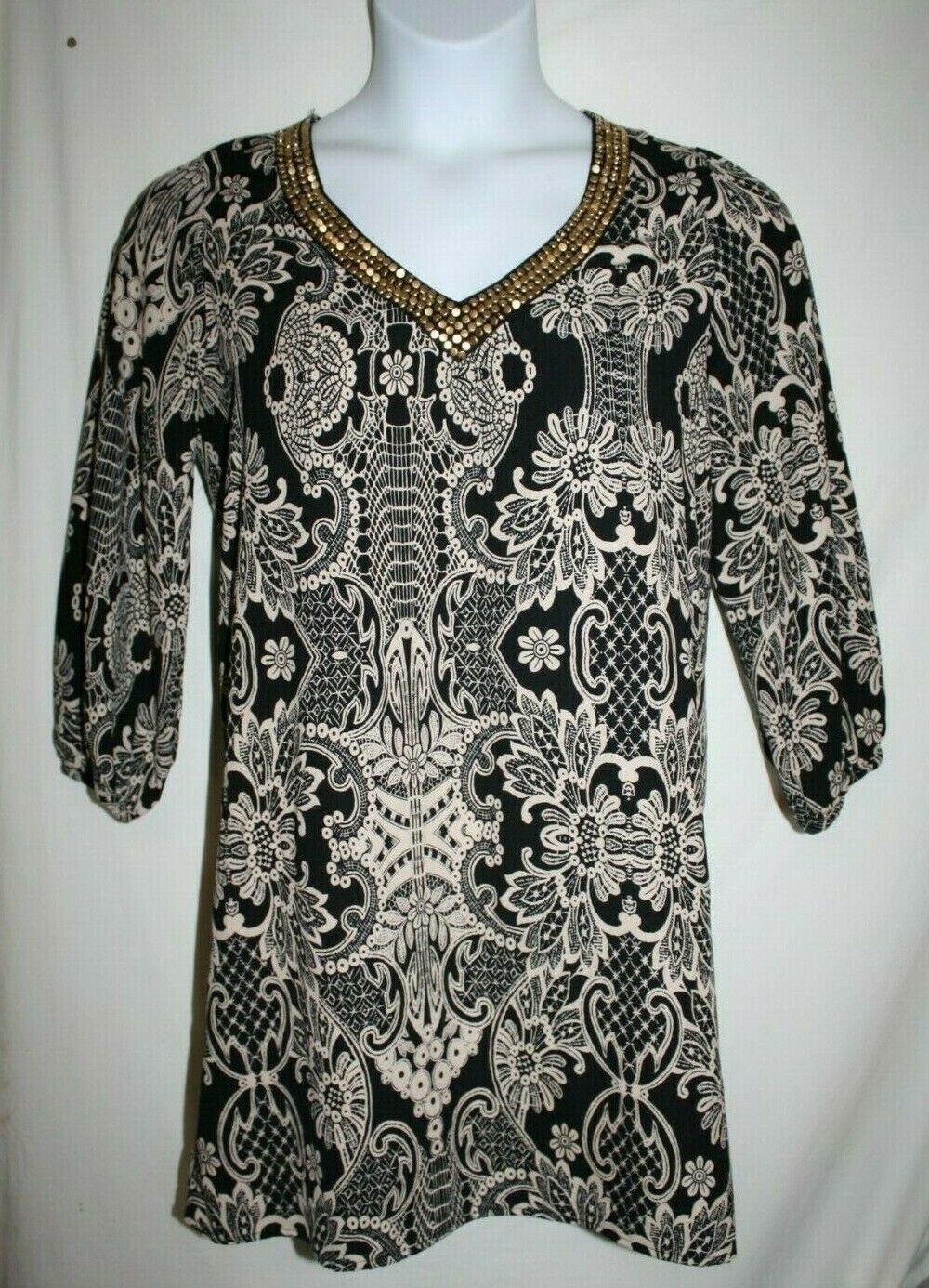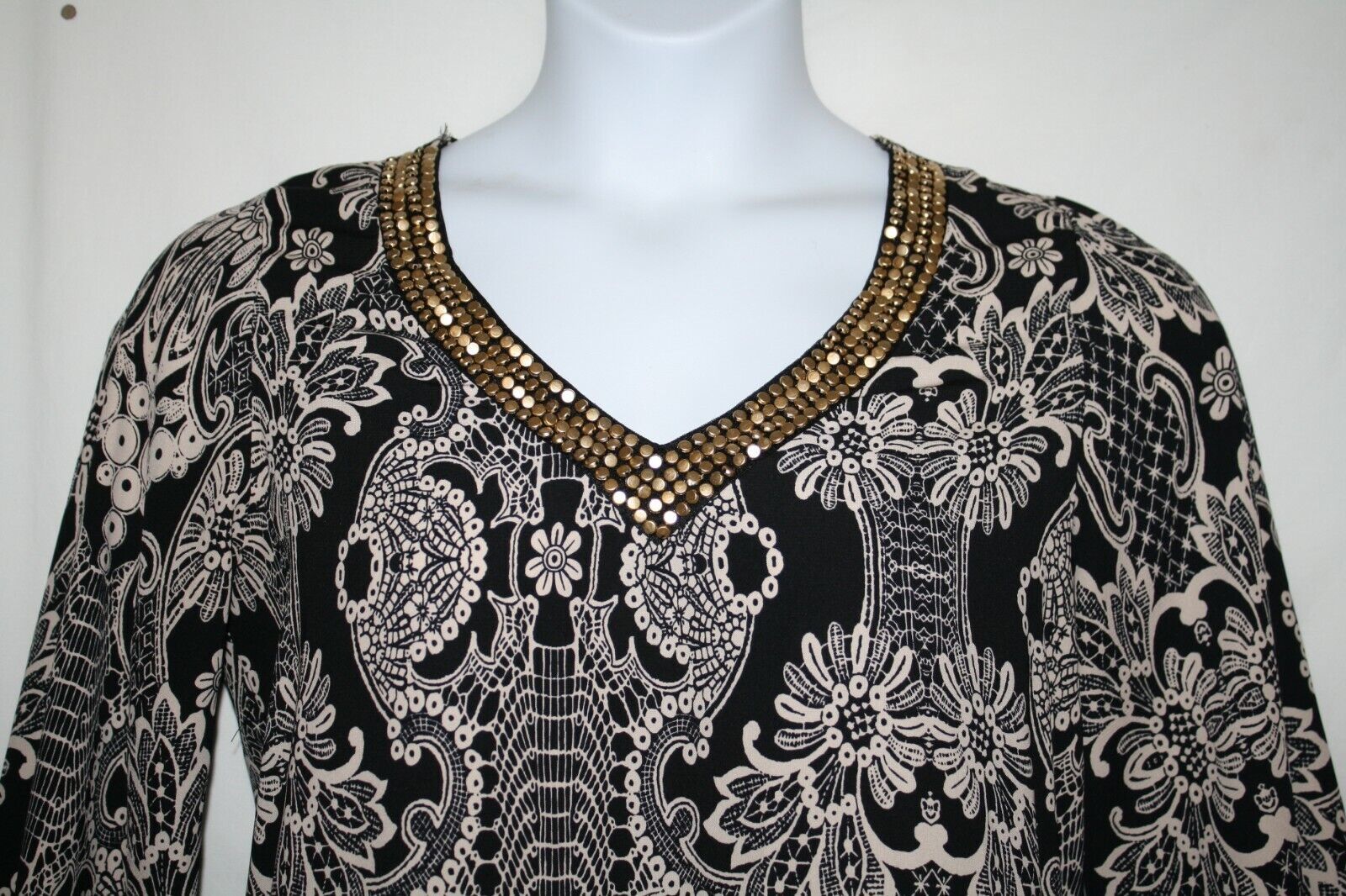 Sage Brand Misses LARGE Black Beige Gold Beaded Floral Dress V Neck 3/4 Sleeves