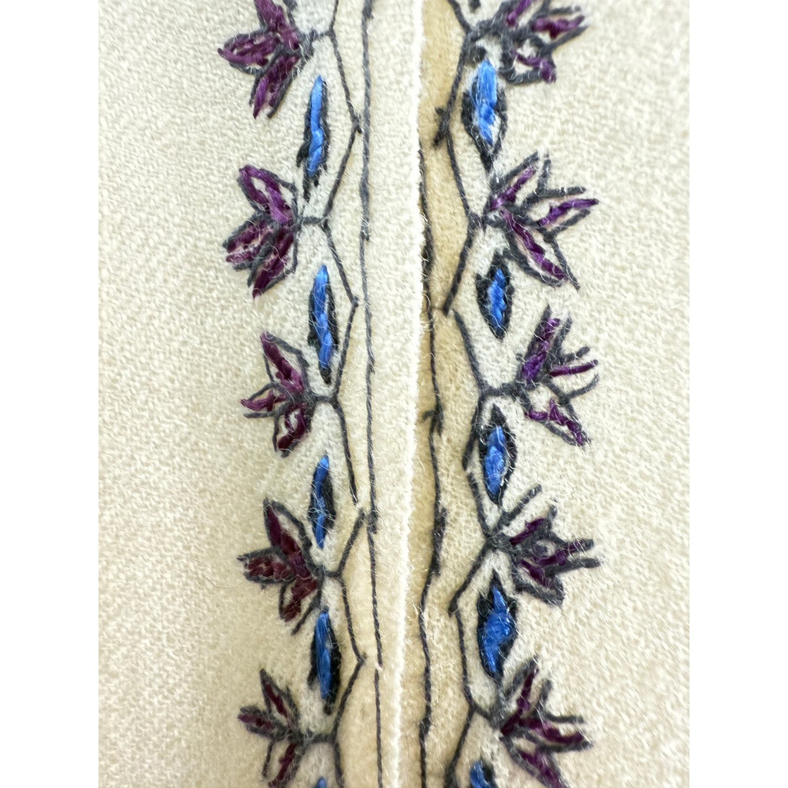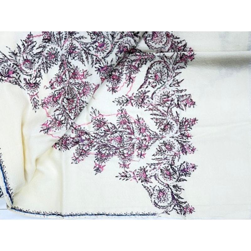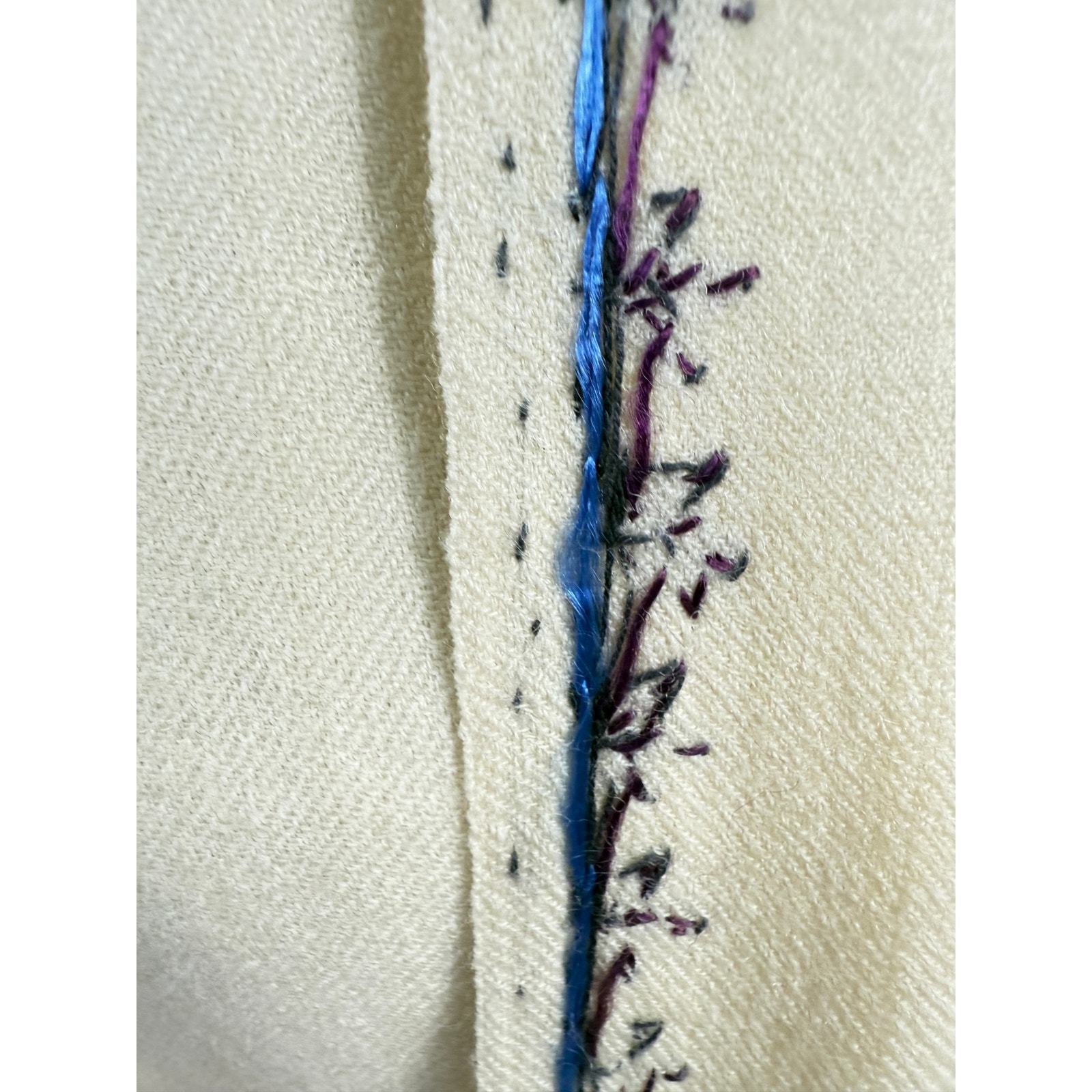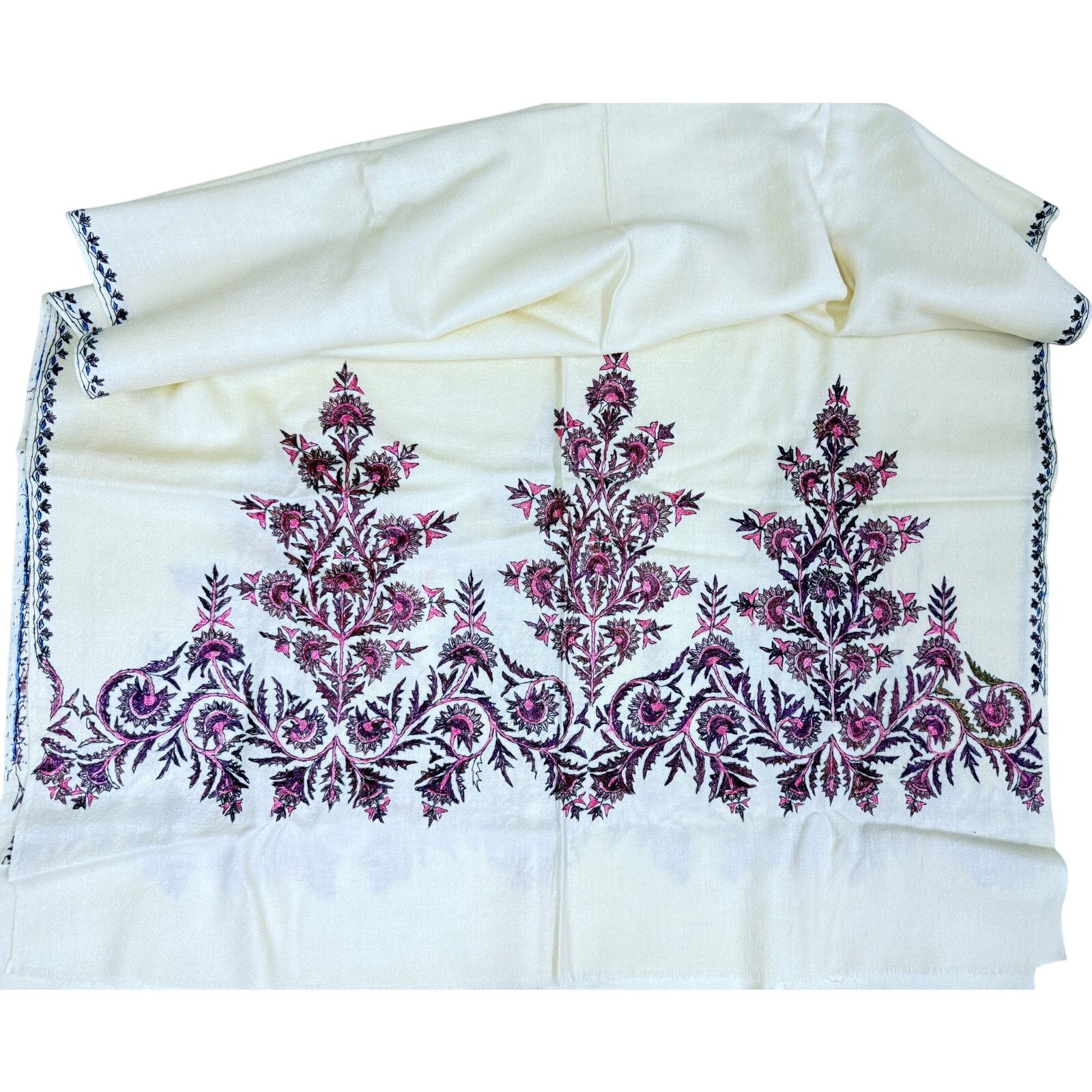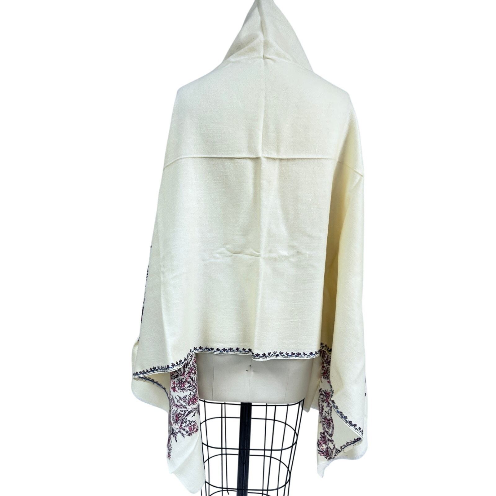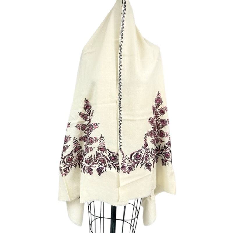 Fantastic primitive natural handwoven wool shawl with hand embroidery at each end and the edges. The ends have three tall, purple, and fuchsia sharp floral designs. The edges are similar but have a touch of cobalt blue. This is in MINT condition but for a small stain as shown and has no moth or flaws. It measures 72 x 31 oe.