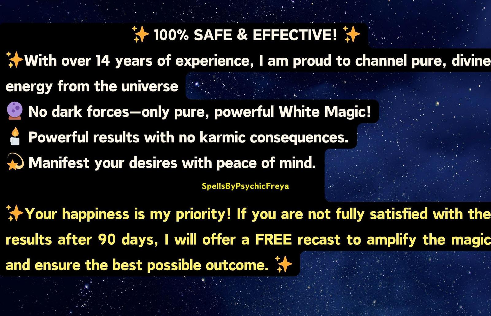 My spells are meticulously crafted with pure, potent white magic?safe, ethical, and immensely powerful. My rituals are infused with ancient wisdom, rare ingredients, and invocations that whisper to the universe itself, commanding the energies to align in your favor.