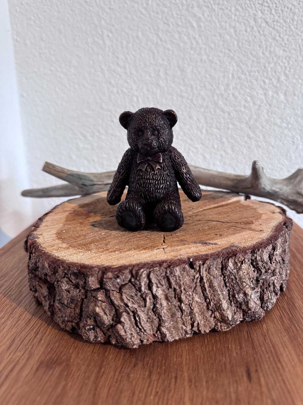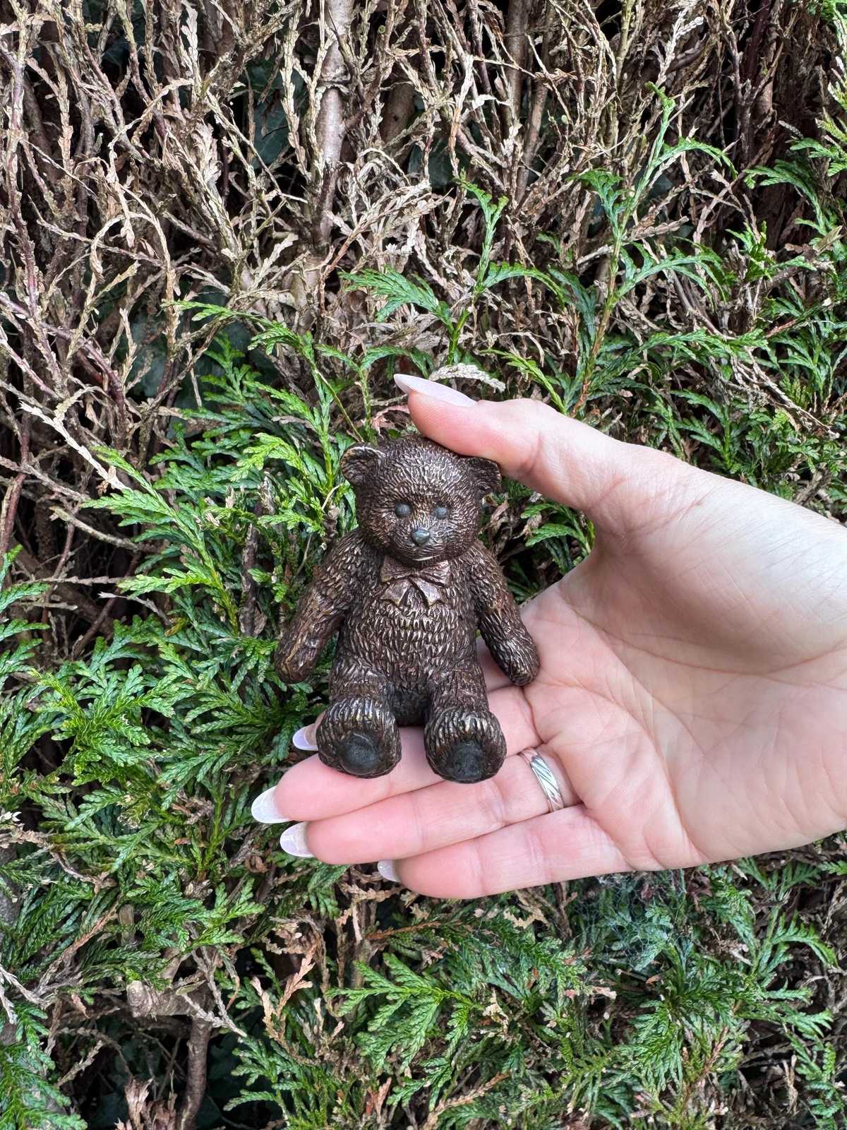 Bronze sculpture of a teddy bear with a bow. A sweet and nostalgic piece, perfect for sentimental gifts or cozy decorative accents.