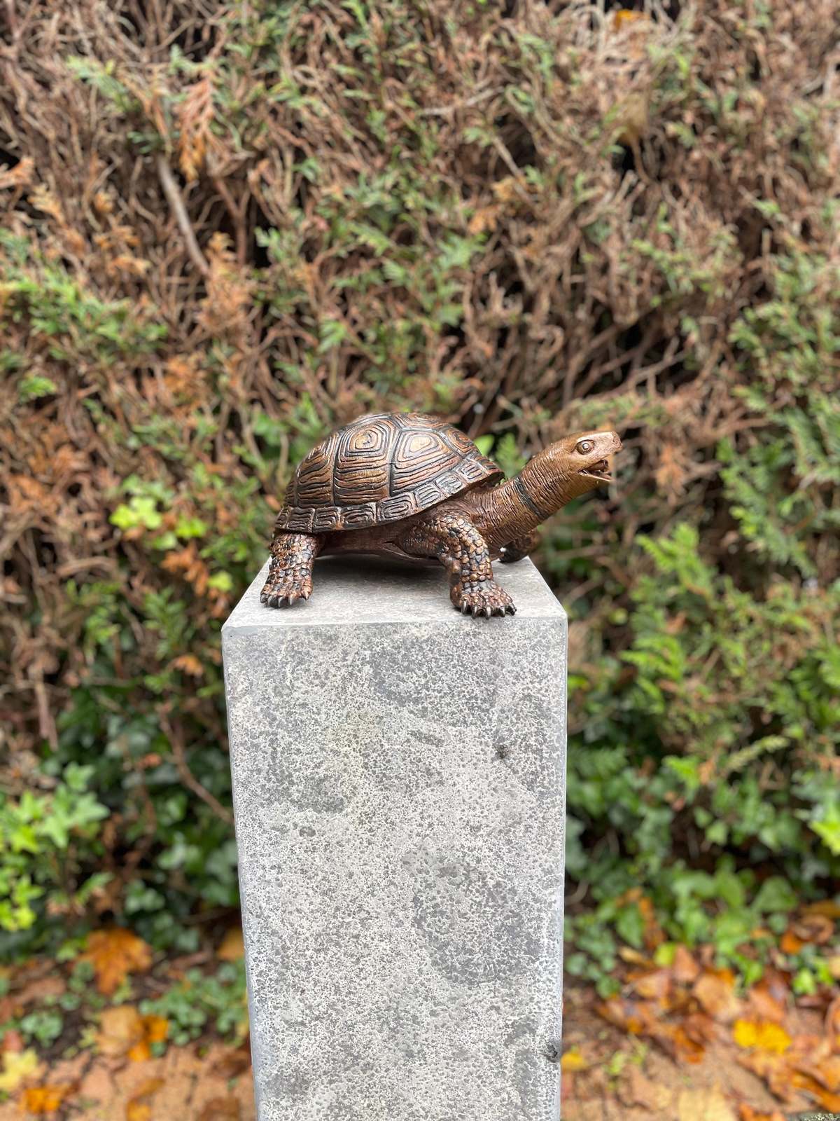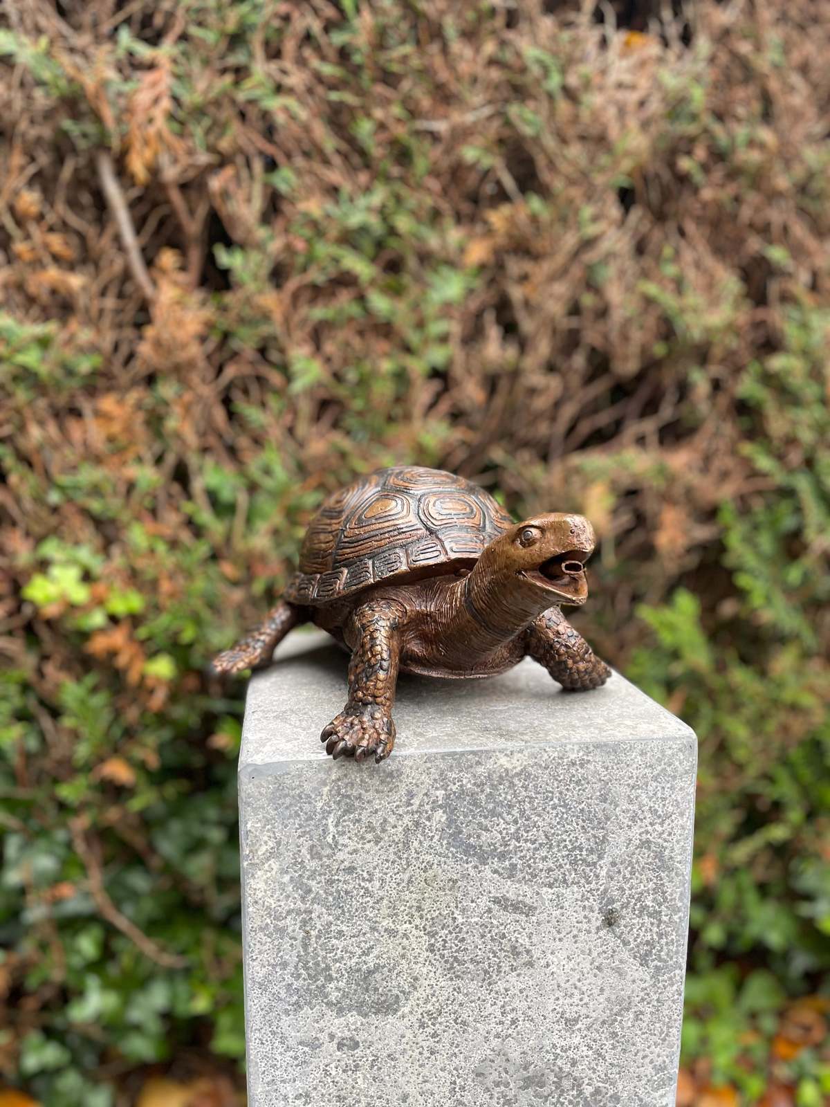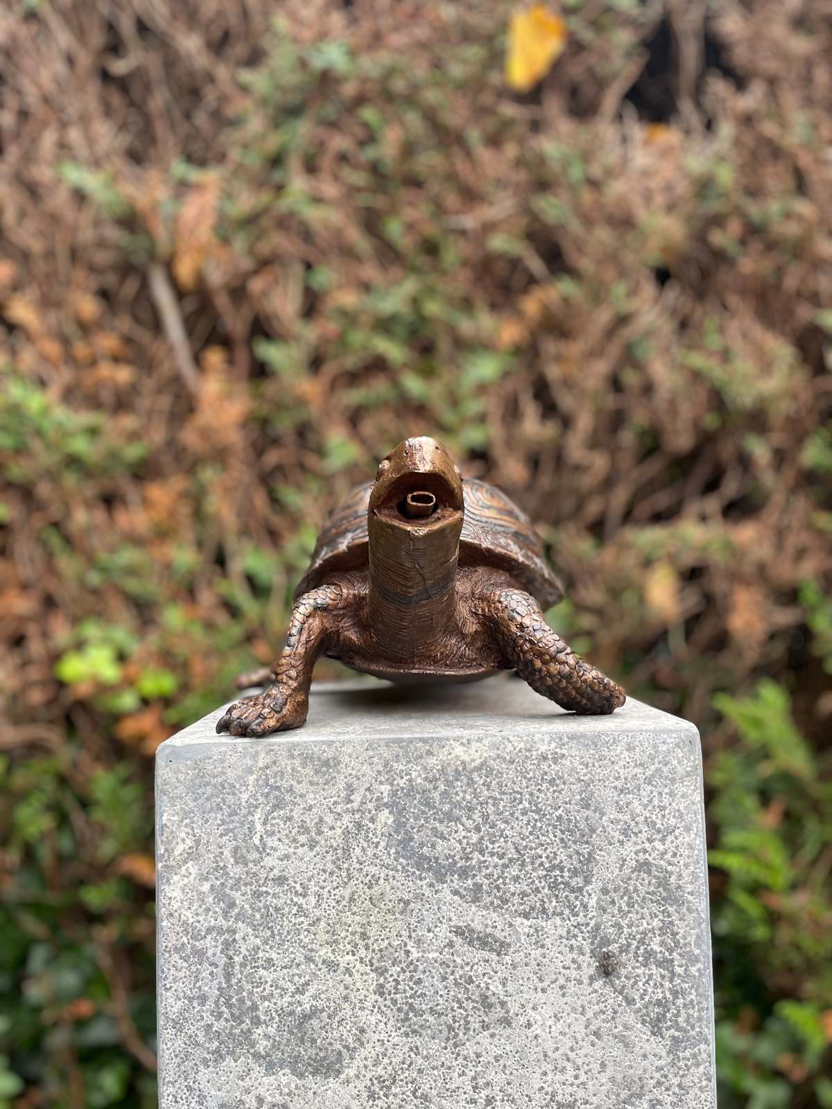 This charming bronze sculpture depicts a realistic turtle mid-step, with its mouth open to create a delightful water stream. Designed as a fountain feature, it brings a playful and serene element to garden spaces, ponds, or patios. The detailed texture of the shell and limbs adds lifelike presence, while the functionality turns it into a unique artistic water element. An ideal fusion of utility and art for nature lovers.