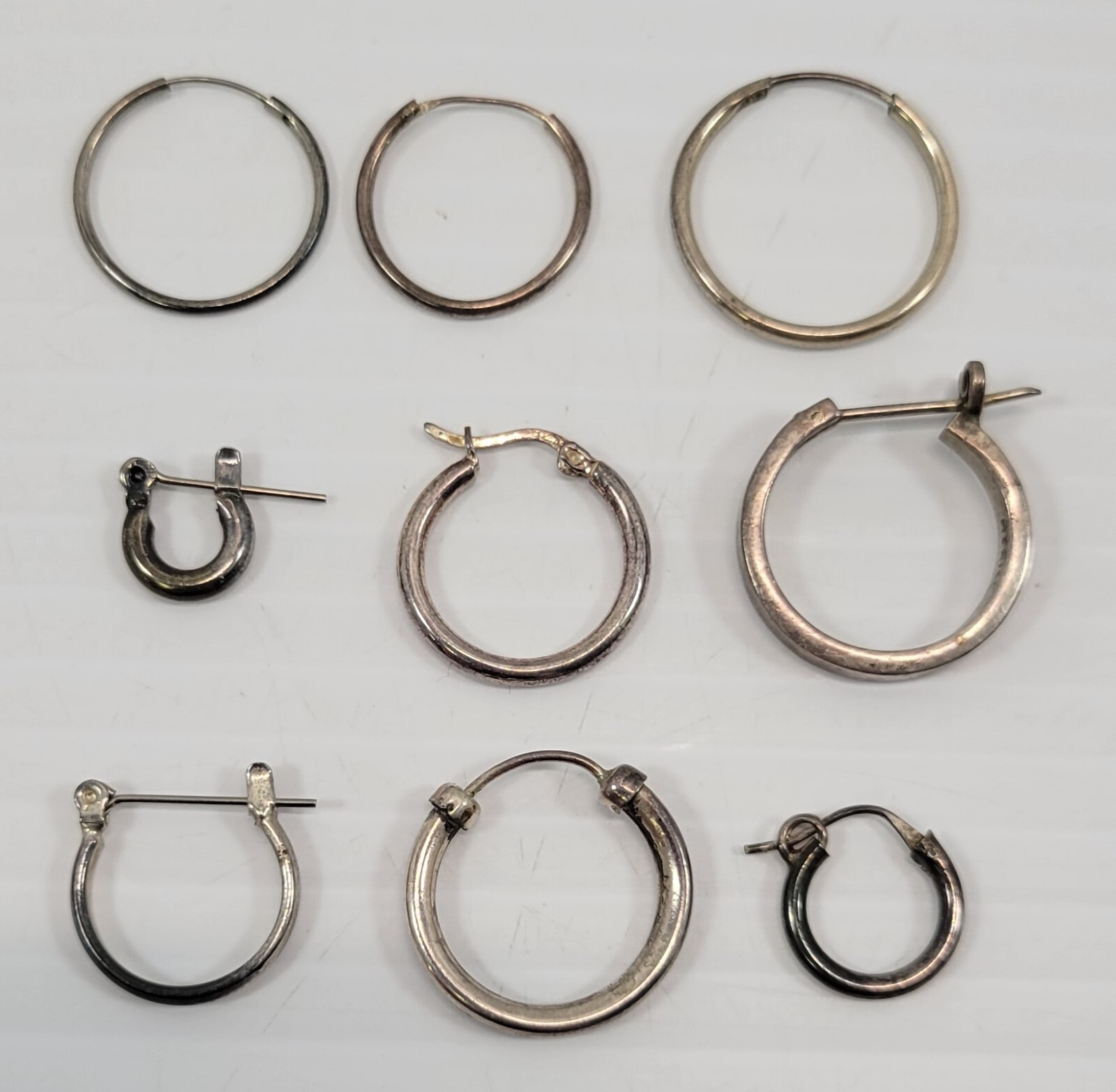 8 single hoop earrings with roughly 3/4" diameter and smaller