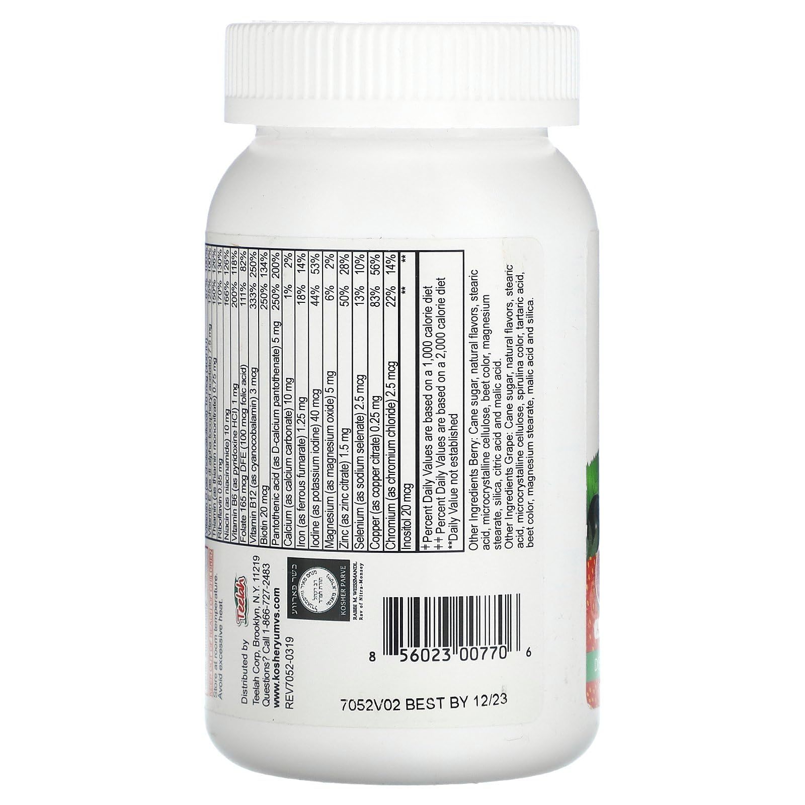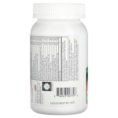 Other Ingredients: Berry Flavor: Cane Sugar, Natural Flavors, Stearic Acid, Microcrystalline Cellulose, Beet Color, Magnesium Stearate, Silica, Citric Acid and Malic Acid. Grape Flavor: Cane Sugar, Natural Flavor, Stearic Acid, Microcrystalline Cellulose, Spirulina Color, Tartaric Acid, Beet Color, Magnesium Stearate, Malic Acid and Silica. Food Sensitivity: This item is free of artificial colors and flavors. Warning: Keep out of reach of children. Do not exceed suggested serving size. If you have a medical condition, are taking medication, or are pregnant or nursing, ask a doctor before using. Not for children under 2 years of age due to risk of choking. Store in room temperature. Avoid excessive heat. Child resistant cap. Keep bottle tightly closed. Do not use this product of safety seal under cap is torn or missing. Disclaimer: These statements have not been evaluated by the Food and Drug Administration. This product is not intended to diagnose, treat, cure, or prevent any disease.