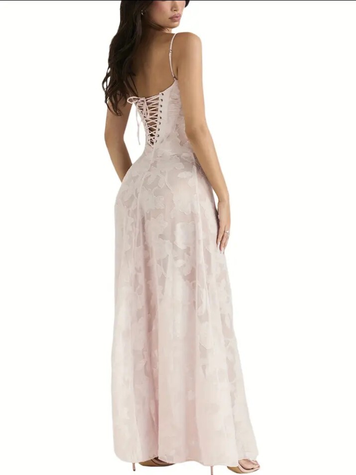 Pale Pink Brocade Lace Up Back Low Cut Bodice Spaggetti Strap Floor Length Summer Dress