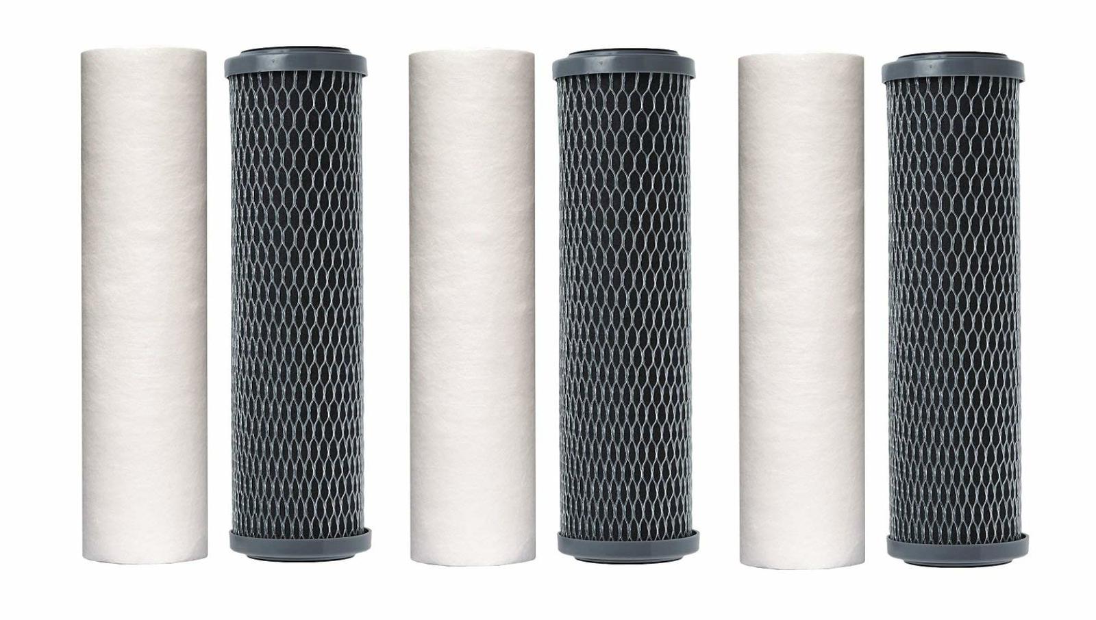 The QMP603 Countertop Water Filter System is a two stage system that holds two standard 10-inch L x 2.5-inch W water filter cartridges. This pack includes: 1- 10" x 2.5" 30-50 micron sediment 1- 10" x 2.5" 5 micron carbon block filter. For best results, replace each filter every 3-6 months.