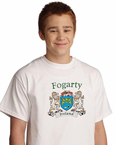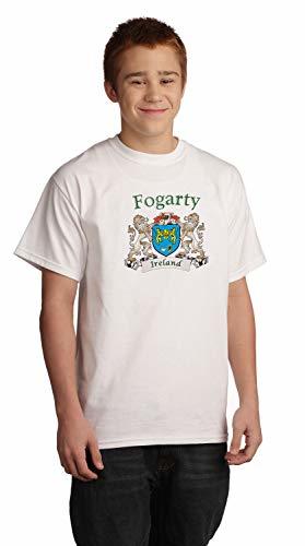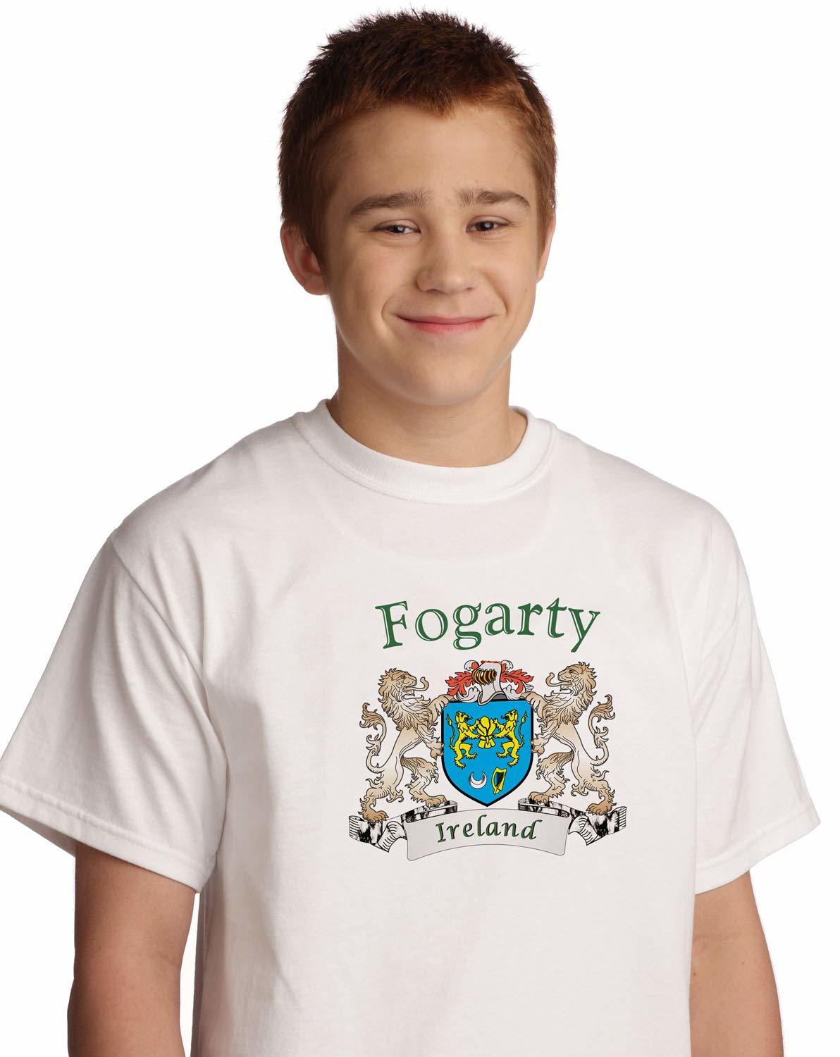 Product description: Fogarty Irish Coat of Arms Tee Shirt in White. Every Irish family has a story to tell, probably hundreds of stories. Your Irish coat of arms is a visual record of your family's oldest, most significant stories. Here, they're told in bright, permanent artwork on these fine-quality, 100% cotton Gildan tee shirts. Over 25 years of heraldry research and over 1000 available Irish family coat of arms.