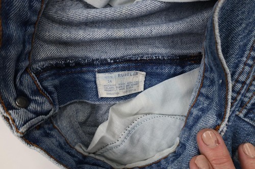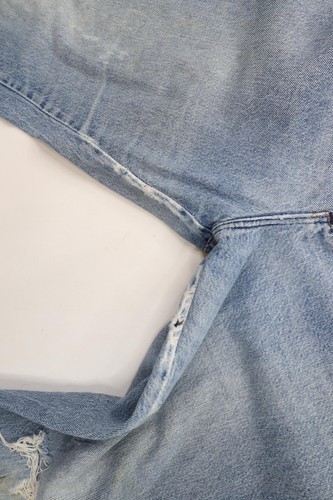 Thrashed. Inner legs distressed/worn/has holes. Hole left knee. Cuffs ripped. Blemishes front and back. USA made
