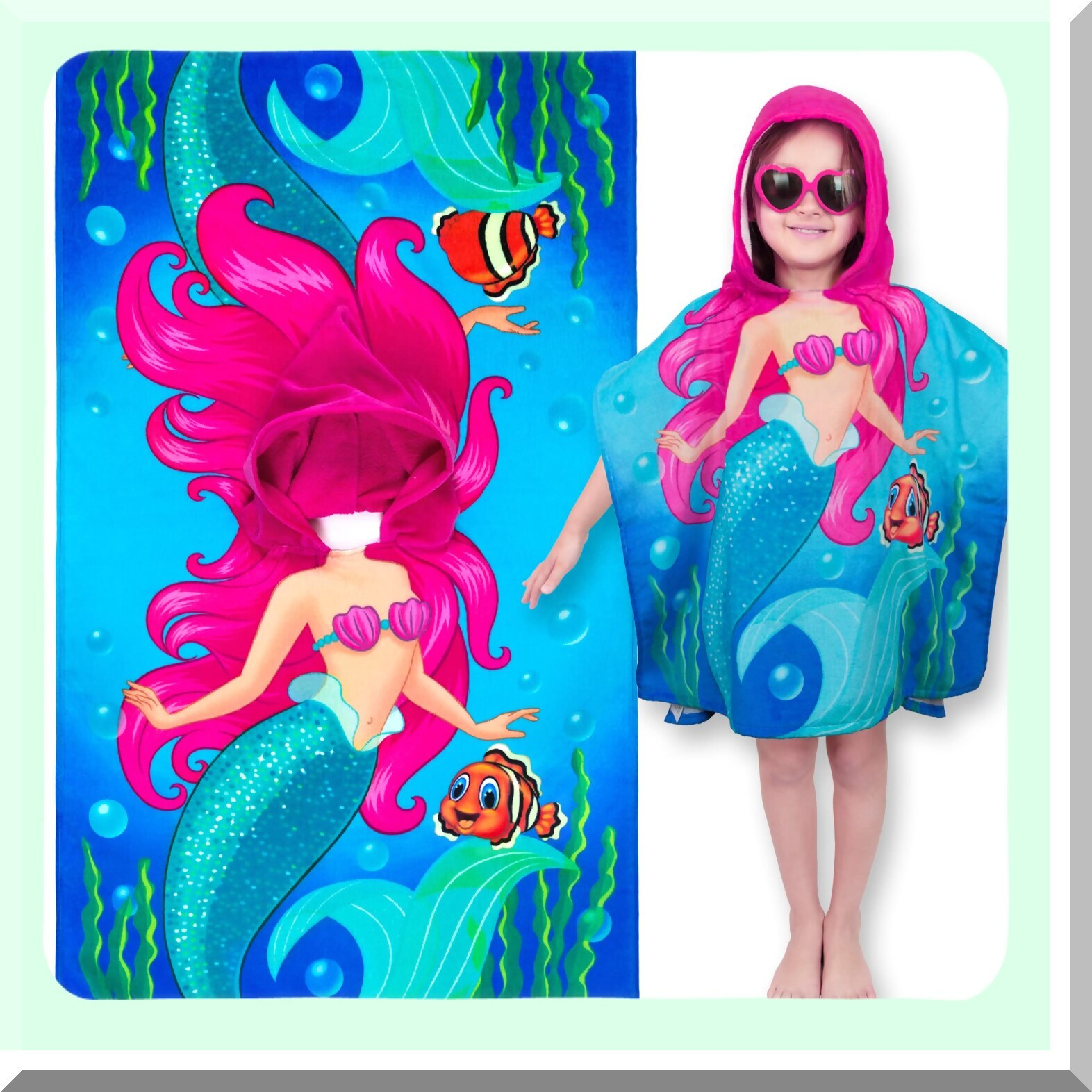 This mermaid hooded poncho towel is designed for children aged 1 to 6, measuring 24" x 48" in full length and 24" x 24" when folded, with a 10.5" x 10" hood. Made from 100% high-quality cotton, it is soft, durable, and quick to absorb water, making it ideal for bath, beach, or pool use. The towel features an open-sided design for easy changing and added privacy, while the hood provides extra comfort and helps dry hair and face simultaneously. Its versatile design allows it to function as a towel, poncho, or bathrobe, making it perfect for various water-related activities. Easy to care for, it can be machine washed warm, tumble dried on low heat, and should not be bleached. This fun mermaid-themed towel combines practicality with playful style, ensuring your child stays comfortable and dry after swimming or bathing.