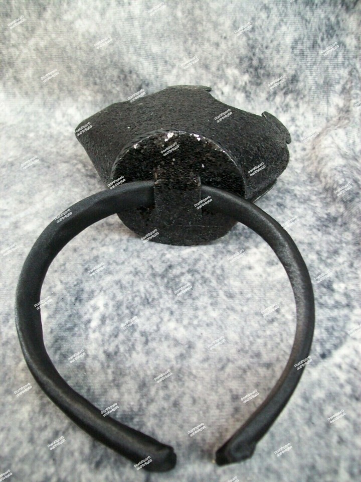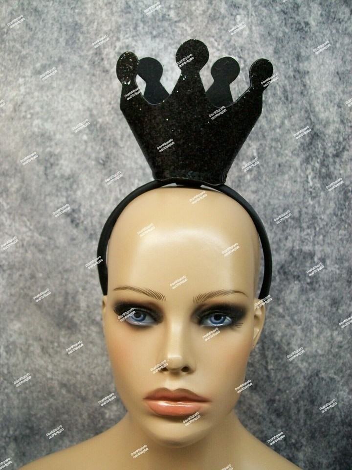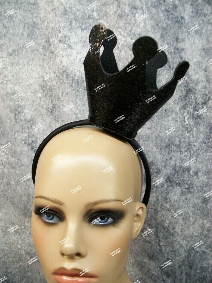 Wicked Gothic Mini Evil Queen Costume Crown Headband. This is a small / mini crown and can slide on headband to change position. Can be worn to the side or on top. Black Glittery with small sequins at base. Glitter will shed. Shaping in the top maybe required as this is new in package and tends to flatten. Could be propped open with like a toothpick or something similar. (Additional aids not included) Adult Use. One size fits most. The headband is flexible so it could fit various head sizes. Could be used as an accessory with many costumes. DOES NOT INCLUDE MANNEQUIN.