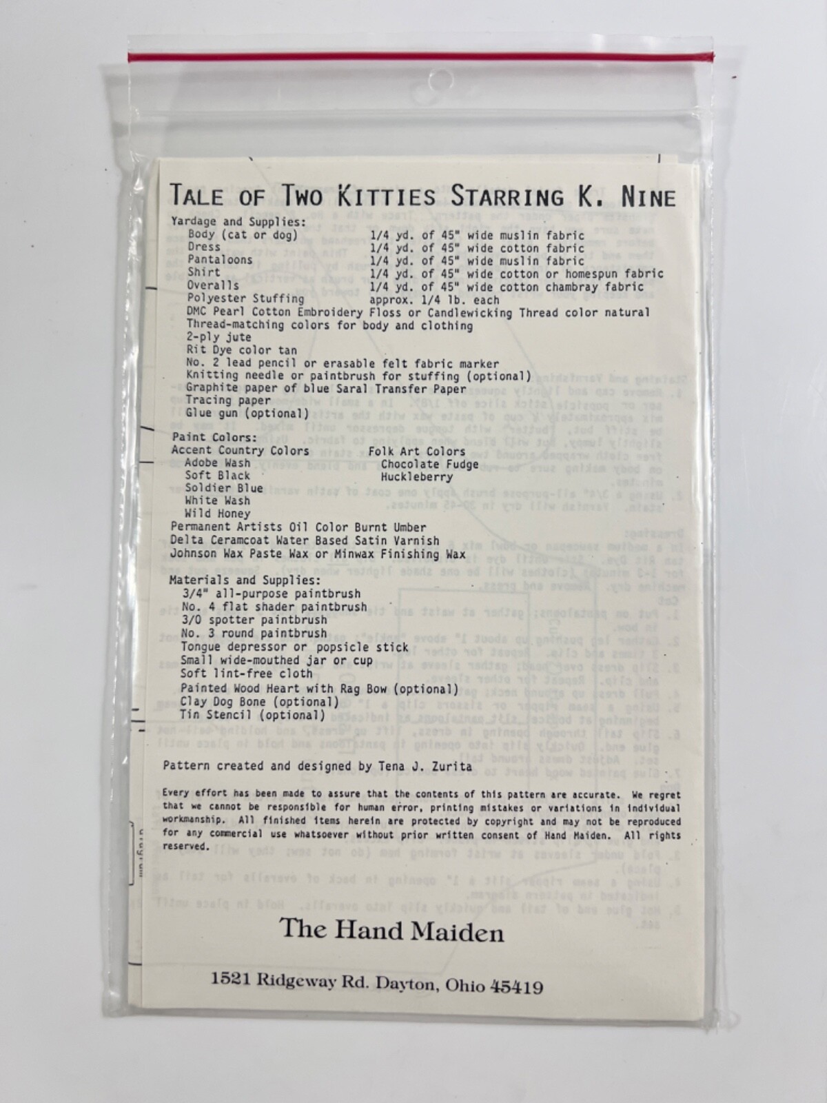 Tale of Two Kitties The Hand Maiden Vtg 1988 Sewing Pattern Stuffed Plush Toy