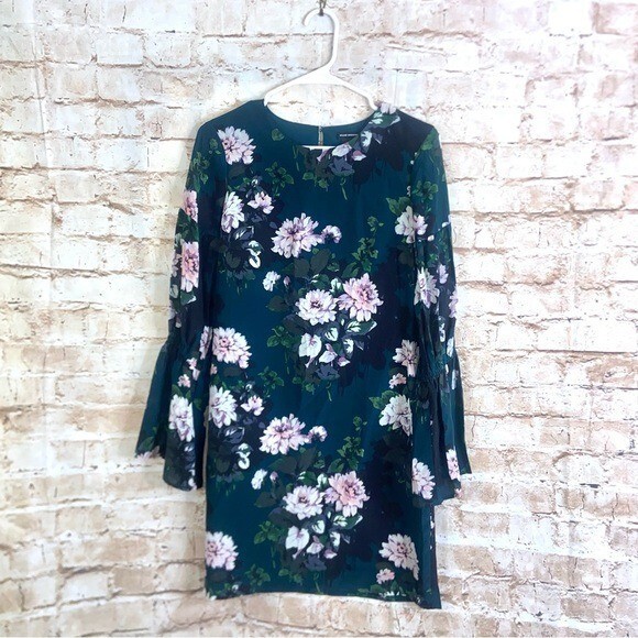 Club Monaco Sanai 100% Silk Floral Shift Dress Size 2 /100% Silk - Polyester lining / round neckline / keyhole back neck / bell sleeve that cinches at elbow. Green floral