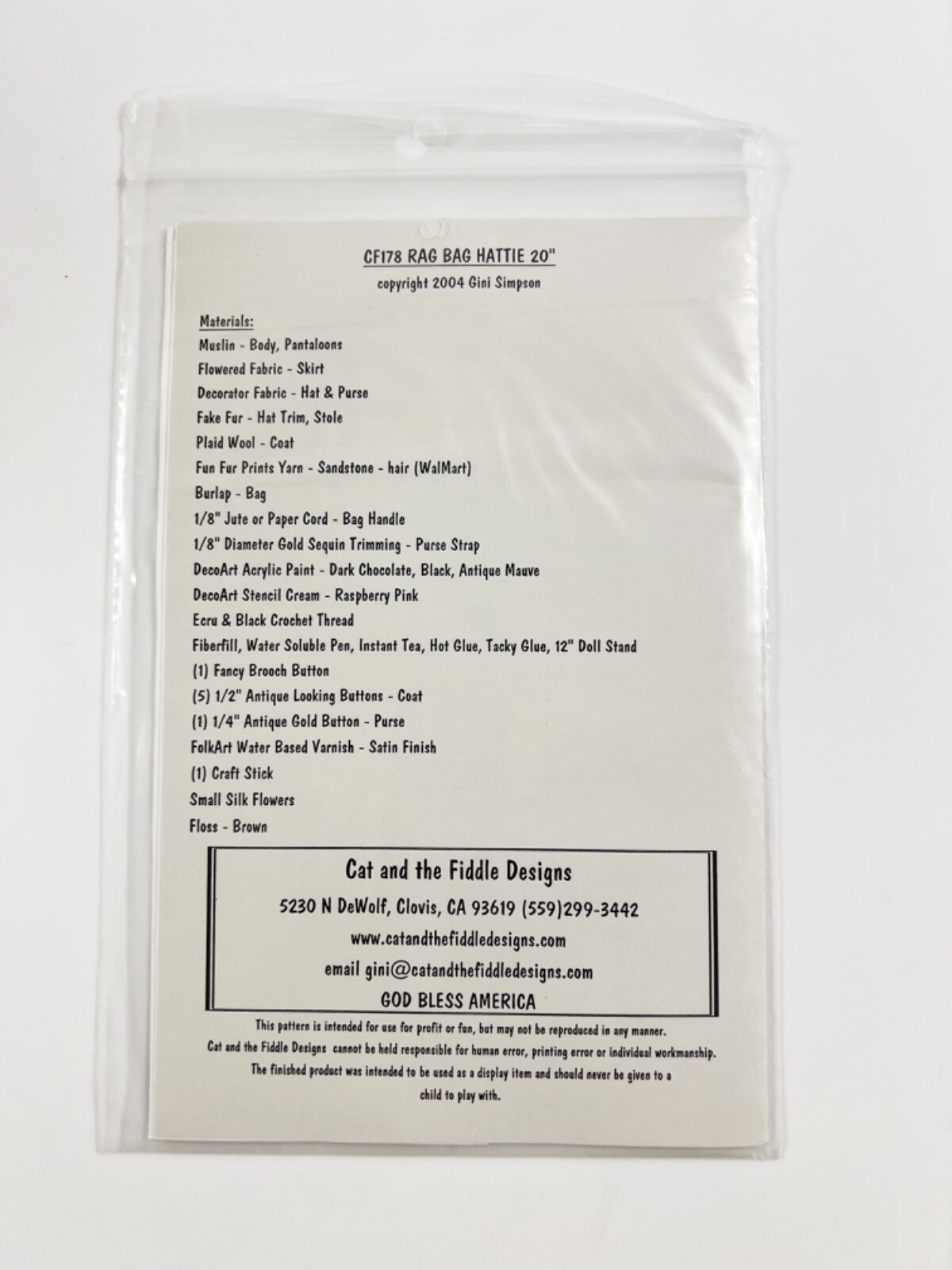 Cat and the Fiddle Designs CF178 Rag Bag Hattie Doll Pattern 20"