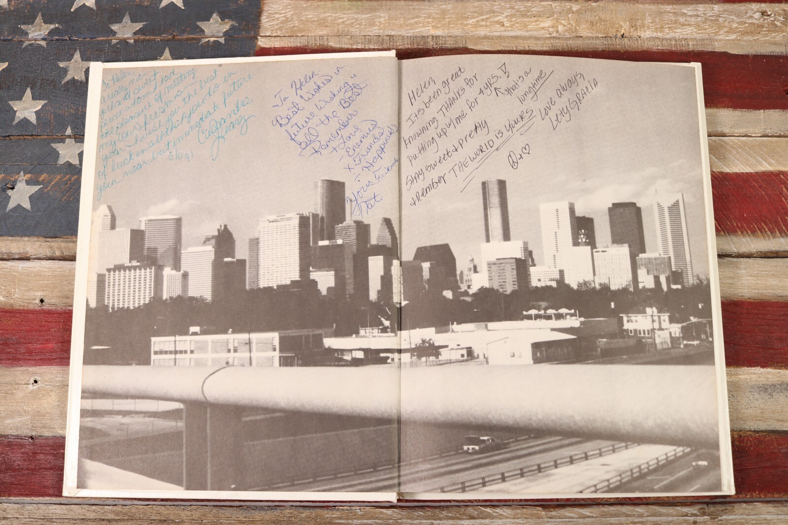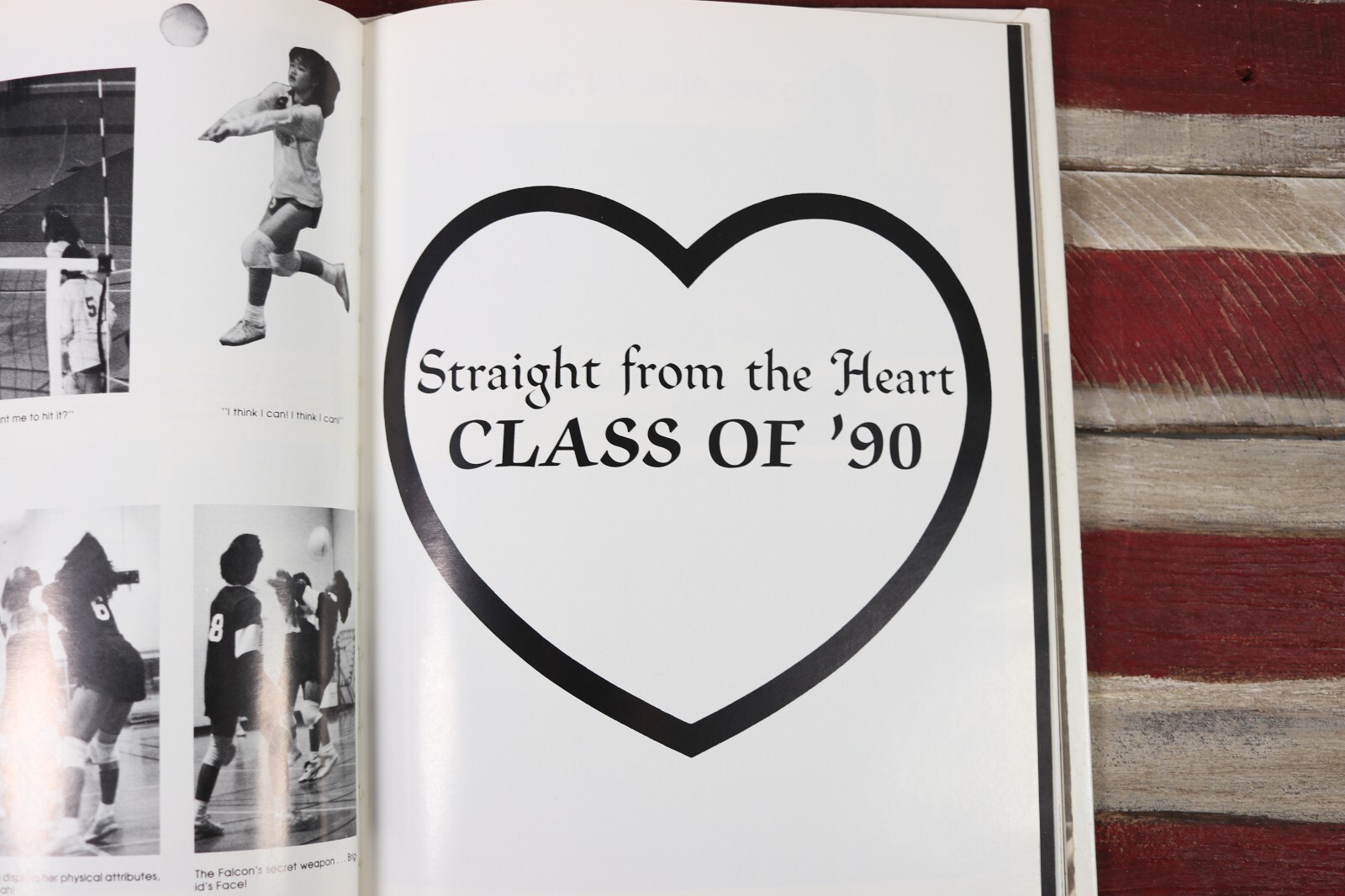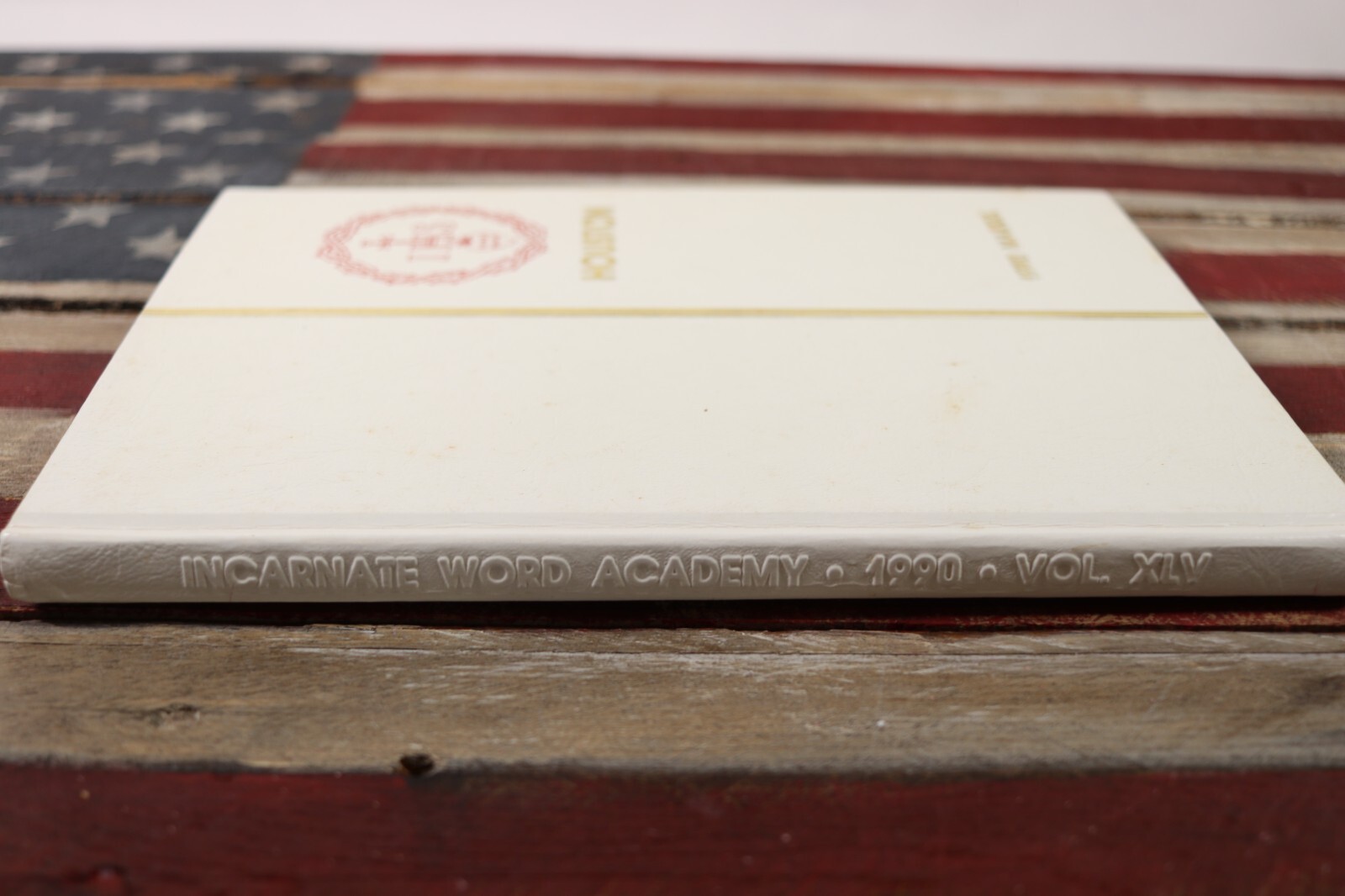 The product is a 1990 Heart of Houston Texas Margil Incarnate Word Academy School Yearbook Volume 4. It is signed, adding a personal touch to this historical memorabilia collectible. This yearbook captures memories from the school year of 1990, offering a glimpse into the students, teachers, and activities of the Incarnate Word Academy in Houston, Texas. Perfect for those interested in collecting school yearbooks or preserving educational history.