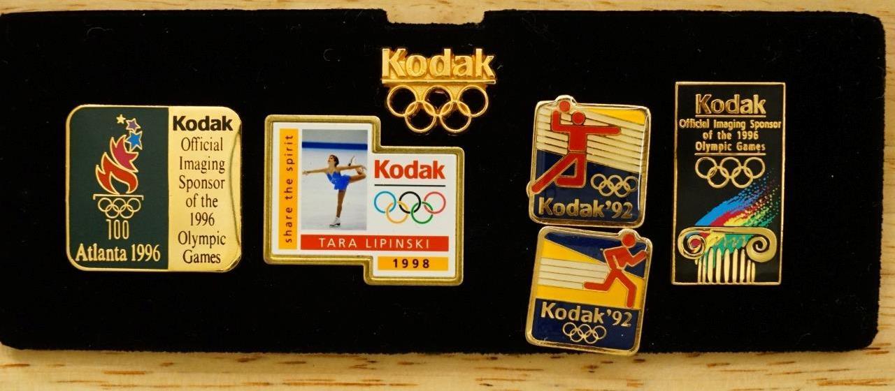Lot 6 KODAK Olympic Souvenir Advertising Pins Barcelona 1992 Atlanta 1996 and 1998 Tara Lipinski. Crisp excellent condition.