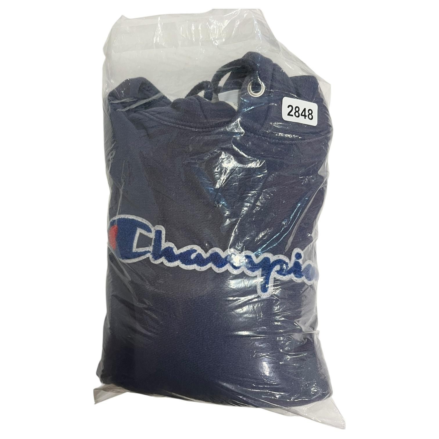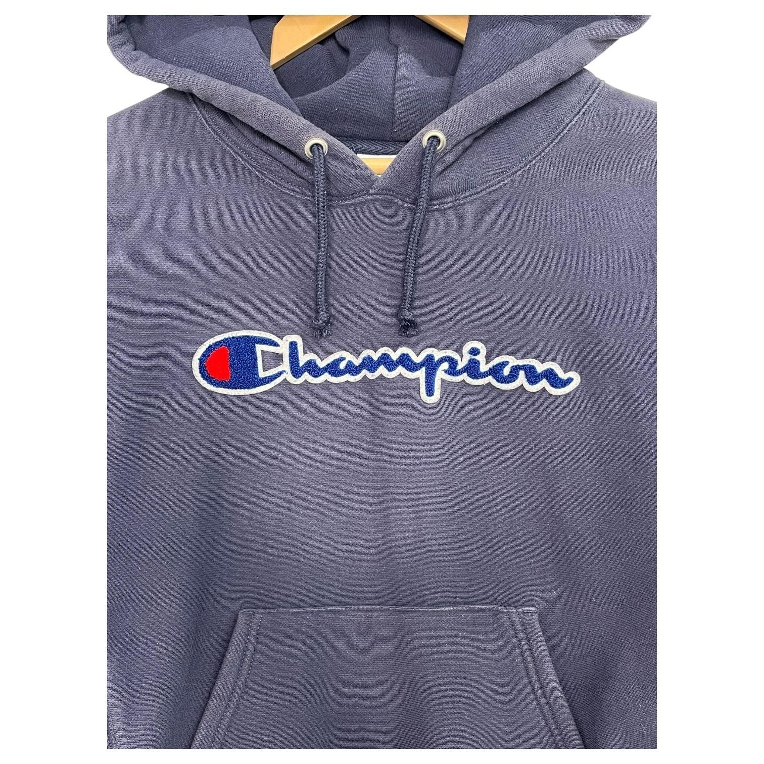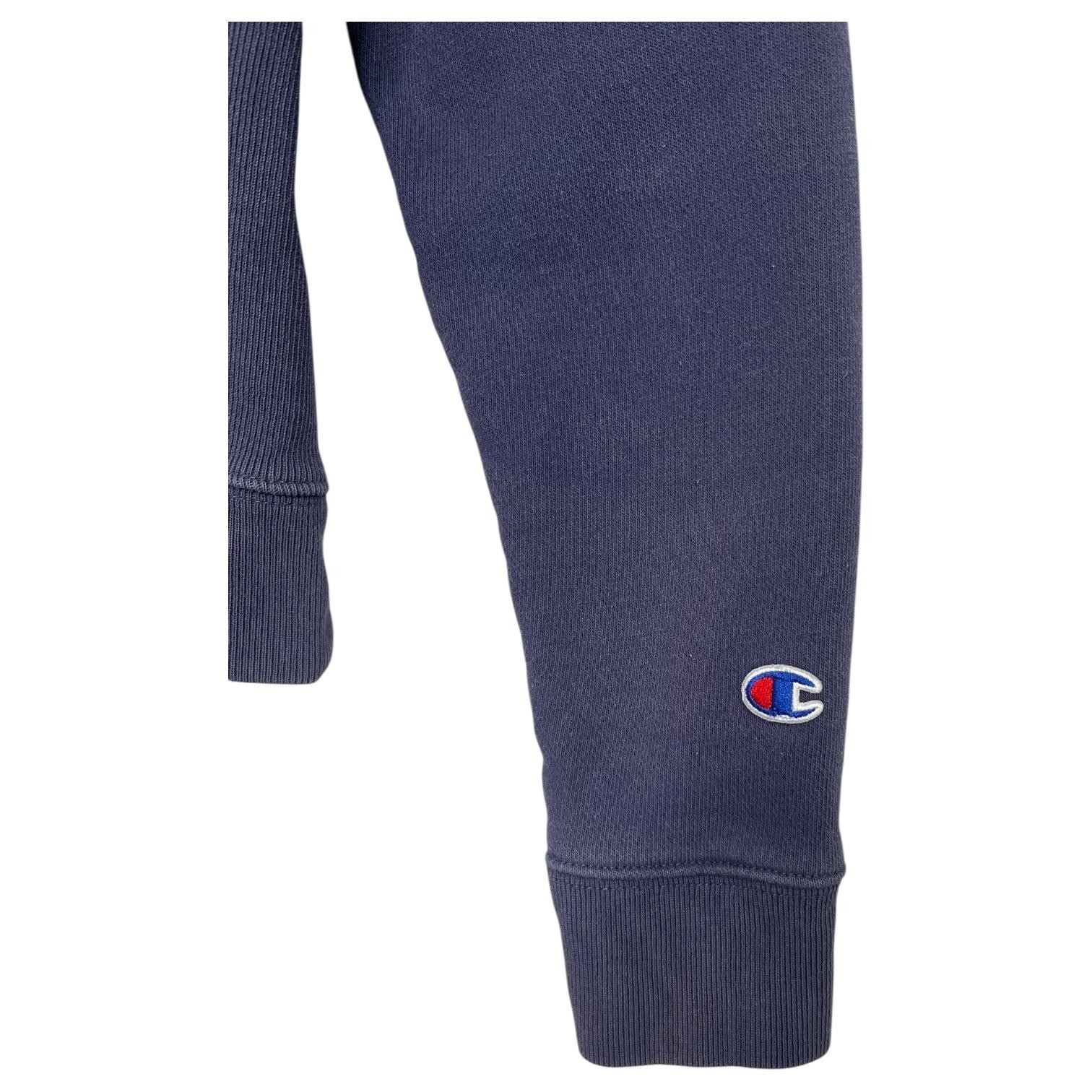 Features Champion script logo embroidered across the chest in white and blue with red accent, and small Champion C embroidered logo on left sleeve.