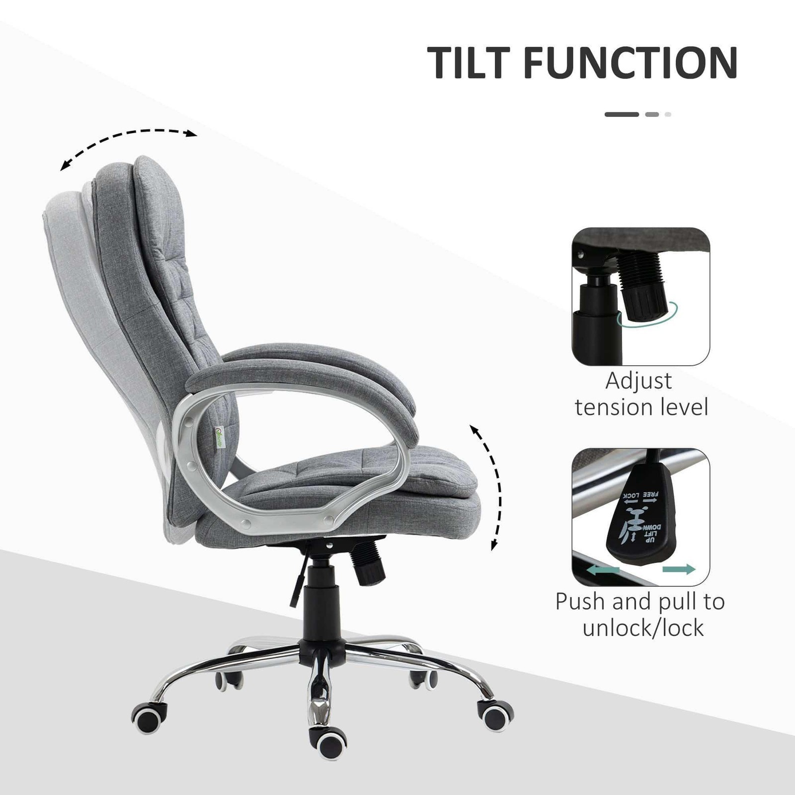 Elevate Your Workspace with Comfort and Style! Introducing our Ergonomic High Back Executive Office Chair, designed to transform your sitting experience into one of unparalleled comfort and support. Upholstered in a sleek light grey linen fabric, this chair not only enhances the aesthetics of your office but also prioritizes your well-being. Key Features: Cozy Design: Enjoy exceptional comfort with a high back, wide, padded armrests, and dedicated lumbar support, making long hours of work a breeze. Comfortable Seating: Thick, densely padded upholstery provides ultimate support, preventing sedentary fatigue while ensuring a soft and inviting seat. Adjustable Height and Tilt Function: Customize your sitting experience with an adjustable seat height and a tilting backrest to alleviate back pain. Flexibility and Stability: Featuring a robust electroplating five-star base and PU wheels, this chair allows for smooth, 360-degree movement around your workspace. This Ergonomic High Back Executive Office Chair is perfect for home offices, conference rooms, or any workspace in need of a touch of elegance and comfort. Experience the difference today and make your work hours not just productive, but pleasurable. Specifications: Place of Origin: China Main Color: Light Grey Main Material: Foam Weight: 31.46 lbs Overall Dimensions: 25.25" L x 29.5" W x 40.5"-43.75" H Seat Height Range: 18"-21.25" Weight Capacity: Up to 265 lbs Transform your workspace today with this stylish and comfortable chair that promises not just functionality but also an elevated aesthetic. Order yours now!