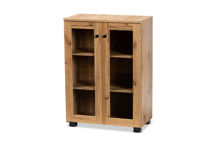 With a minimalist yet bold design, the Laurien storage cabinet organizes your space in contemporary style. Made in Malaysia, this cabinet is constructed from oak brown finished wood that adds visual warmth to the current interior of your home. Three spacious shelves behind the glass doors create a convenient display to organize decorations and declutter busy rooms. Requiring assembly, the Laurien is equipped with two black finished metal door knobs that add a modern touch to the rustic aesthetic of the cabinet. A handy addition for any kitchen, living room, or hallway, the Laurien storage cabinet is a versatile upgrade to the modern home.