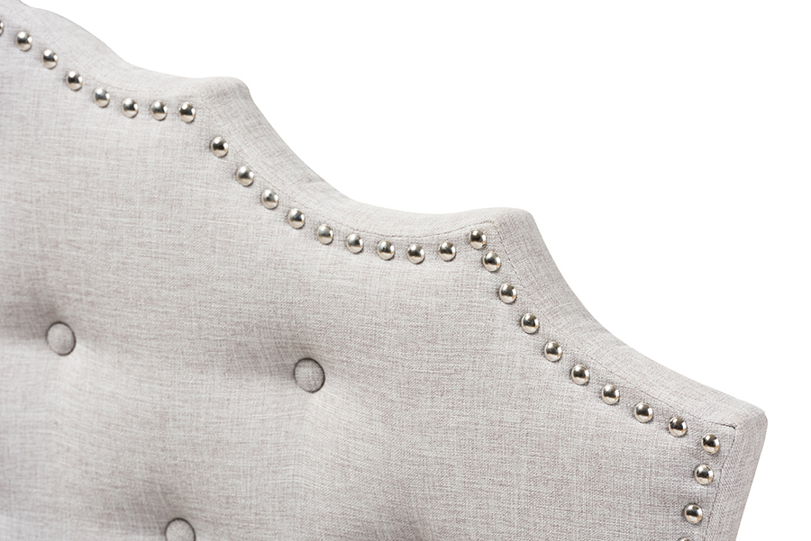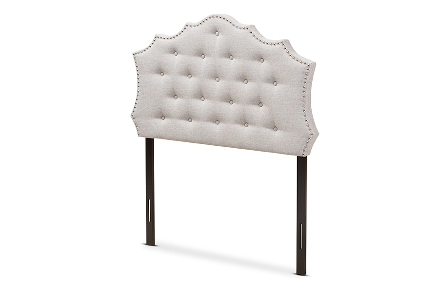 Classic finishes and an elegant curved shape make the Moscow fabric upholstered headboard the perfect centerpiece in your bedroom or guest room. Constructed of solid rubberwood frame, the Moscow headboard is upholstered in greyish beige or dark Graypolyester fabric that is durable. Featuring curvaceous style lines with button-tufted design, the Moscow is glamorously trimmed with silver nail heads. The headboard is supported sturdily by solid wood posts and is exceptionally cushioned to provide softness and shape while you sit up. Made in Malaysia, the headboard requires assembly.