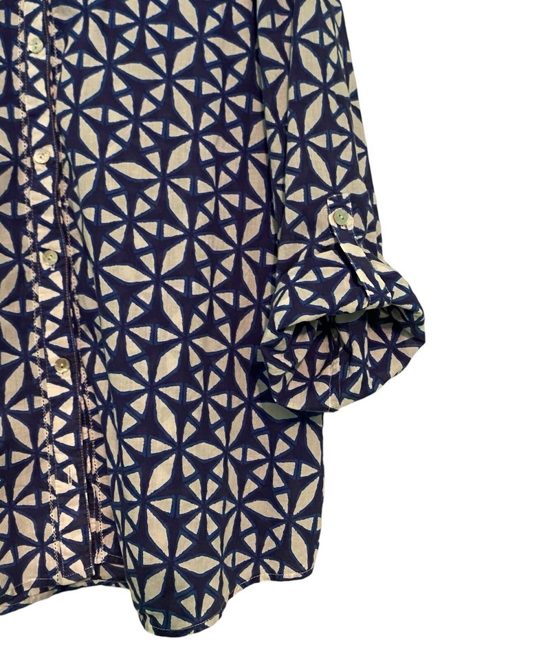 Chicos Blue White Blouse Size 3 Geometric RollTab Sleeves Hi Low Sheer Cotton